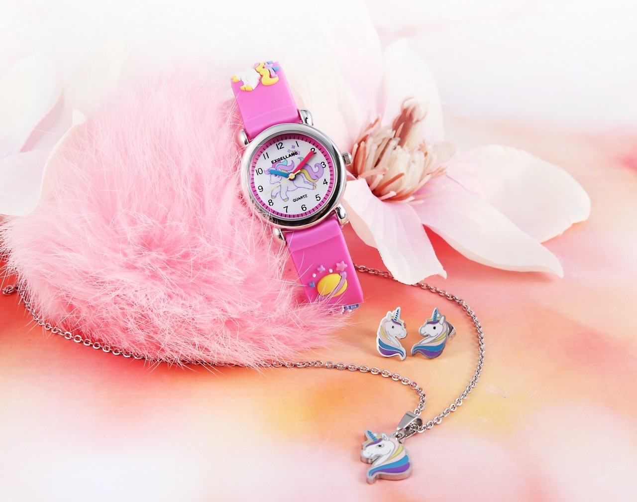 O relógio de pulso infantil analógico de 3 ponteiros da Excellanc possui o movimento de quartzo PC21 de alta qualidade. A pulseira de silicone tem 14 mm de largura na alça e pode ser aberta e fechada com uma fivela. O comprimento total do relógio é de 20 cm. A caixa de metal com vidro mineral tem um diâmetro de 27 mm e uma altura de 10 mm. O fundo da caixa é feito de aço inoxidável. A pulseira de borracha colorida é decorada com dois grandes unicórnios e vários motivos do sistema solar e garante conforto de uso. O mostrador é branco e impresso com números e índices pretos. Há também um grande motivo de…