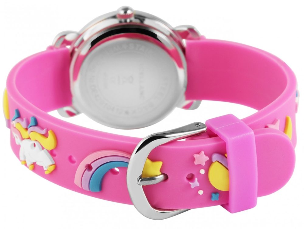O relógio de pulso infantil analógico de 3 ponteiros da Excellanc possui o movimento de quartzo PC21 de alta qualidade. A pulseira de silicone tem 14 mm de largura na alça e pode ser aberta e fechada com uma fivela. O comprimento total do relógio é de 20 cm. A caixa de metal com vidro mineral tem um diâmetro de 27 mm e uma altura de 10 mm. O fundo da caixa é feito de aço inoxidável. A pulseira de borracha colorida é decorada com dois grandes unicórnios e vários motivos do sistema solar e garante conforto de uso. O mostrador é branco e impresso com números e índices pretos. Há também um grande motivo de…