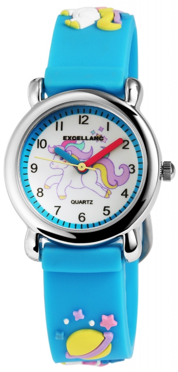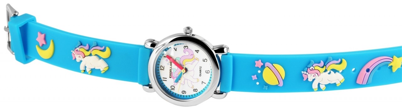 O relógio de pulso infantil analógico de 3 ponteiros da Excellanc possui o movimento de quartzo PC21 de alta qualidade. A pulseira de silicone tem 14 mm de largura na alça e pode ser aberta e fechada com uma fivela. O comprimento total do relógio é de 20 cm. A caixa de metal com vidro mineral tem um diâmetro de 27 mm e uma altura de 10 mm. O fundo da caixa é feito de aço inoxidável. A pulseira de borracha colorida é decorada com dois grandes unicórnios e vários motivos do sistema solar e garante conforto de uso. O mostrador é branco e impresso com números e índices pretos. Há também um grande motivo de unicórnio no mostrador. O ponteiro das horas é azul, o ponteiro dos minutos é vermelho e o ponteiro dos segundos é amarelo. Isso torna o aprendizado e a leitura mais fáceis.