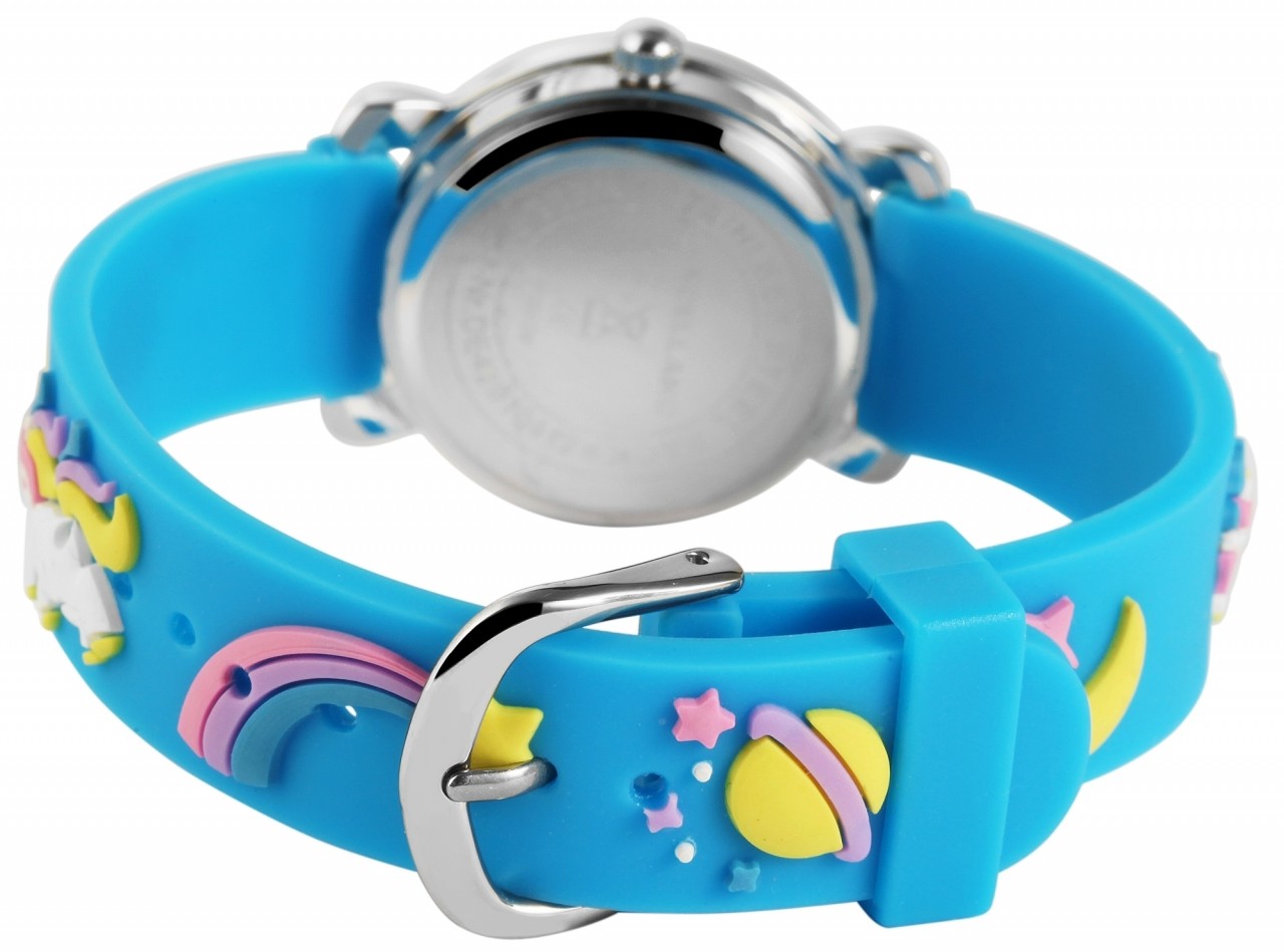 O relógio de pulso infantil analógico de 3 ponteiros da Excellanc possui o movimento de quartzo PC21 de alta qualidade. A pulseira de silicone tem 14 mm de largura na alça e pode ser aberta e fechada com uma fivela. O comprimento total do relógio é de 20 cm. A caixa de metal com vidro mineral tem um diâmetro de 27 mm e uma altura de 10 mm. O fundo da caixa é feito de aço inoxidável. A pulseira de borracha colorida é decorada com dois grandes unicórnios e vários motivos do sistema solar e garante conforto de uso. O mostrador é branco e impresso com números e índices pretos. Há também um grande motivo de…