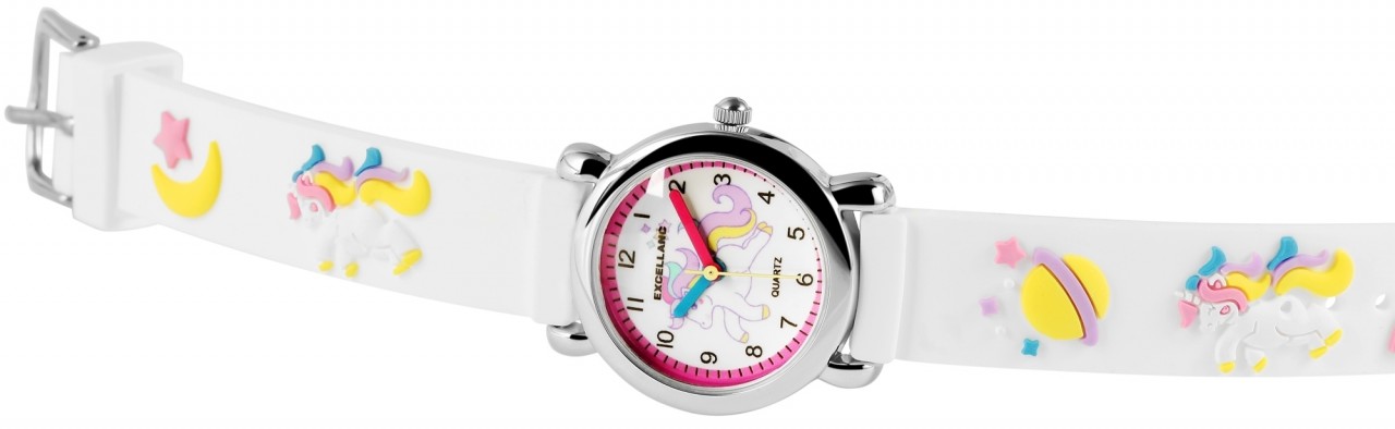 O relógio de pulso infantil analógico de 3 ponteiros da Excellanc possui o movimento de quartzo PC21 de alta qualidade. A pulseira de silicone tem 14 mm de largura na alça e pode ser aberta e fechada com uma fivela. O comprimento total do relógio é de 20 cm. A caixa de metal com vidro mineral tem um diâmetro de 27 mm e uma altura de 10 mm. O fundo da caixa é feito de aço inoxidável. A pulseira de borracha colorida é decorada com dois grandes unicórnios e vários motivos do sistema solar e garante conforto de uso. O mostrador é branco e impresso com números e índices pretos. Há também um grande motivo de unicórnio no mostrador. O ponteiro das horas é azul, o ponteiro dos minutos é vermelho e o ponteiro dos segundos é amarelo. Isso torna o aprendizado e a leitura mais fáceis.