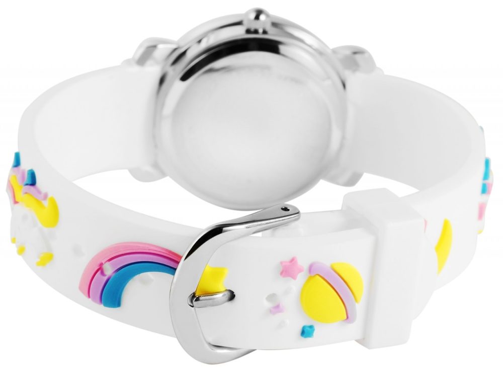 O relógio de pulso infantil analógico de 3 ponteiros da Excellanc possui o movimento de quartzo PC21 de alta qualidade. A pulseira de silicone tem 14 mm de largura na alça e pode ser aberta e fechada com uma fivela. O comprimento total do relógio é de 20 cm. A caixa de metal com vidro mineral tem um diâmetro de 27 mm e uma altura de 10 mm. O fundo da caixa é feito de aço inoxidável. A pulseira de borracha colorida é decorada com dois grandes unicórnios e vários motivos do sistema solar e garante conforto de uso. O mostrador é branco e impresso com números e índices pretos. Há também um grande motivo de…