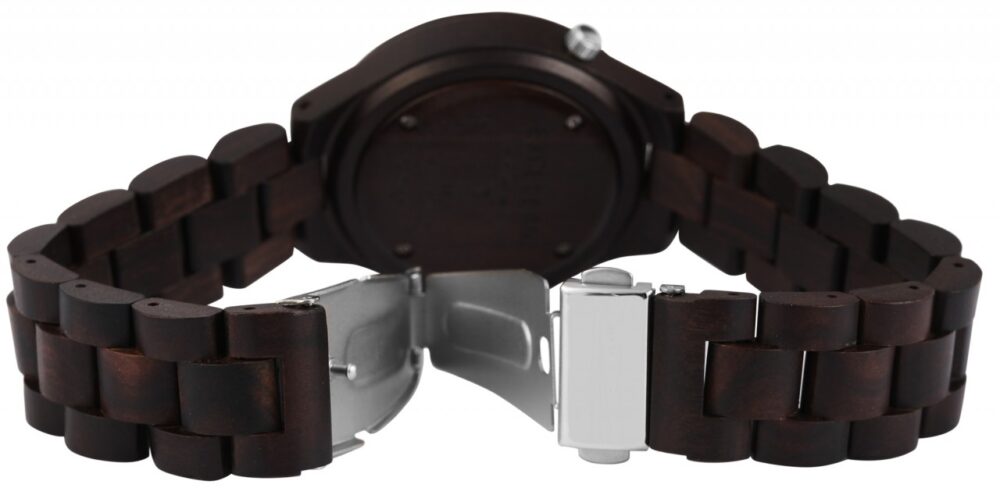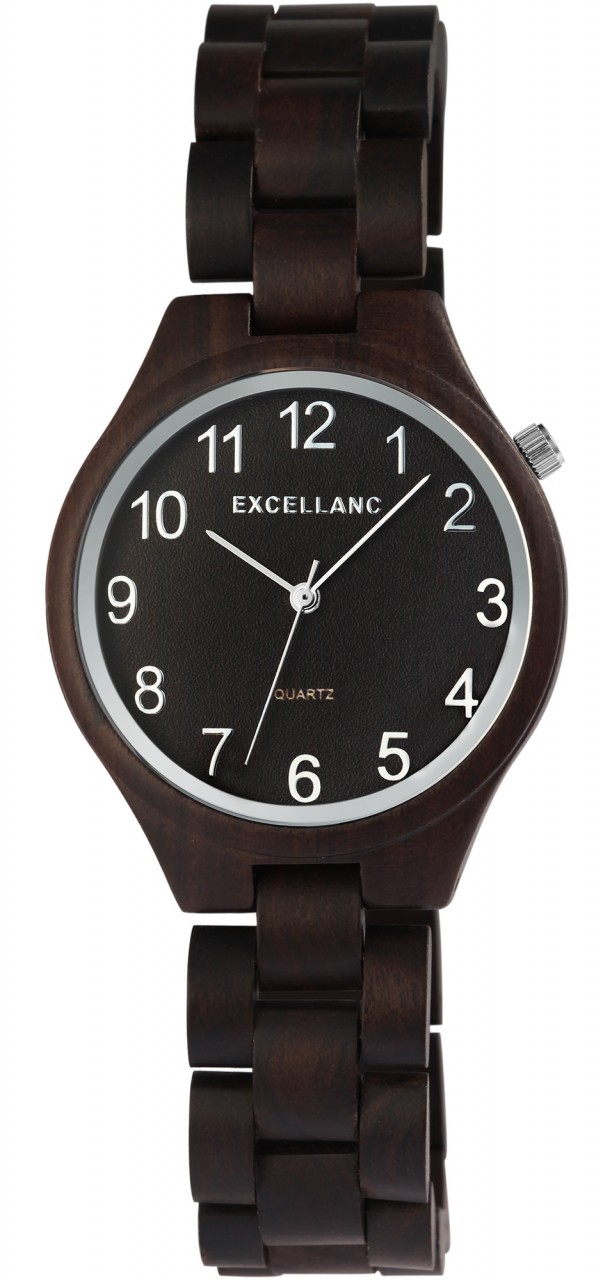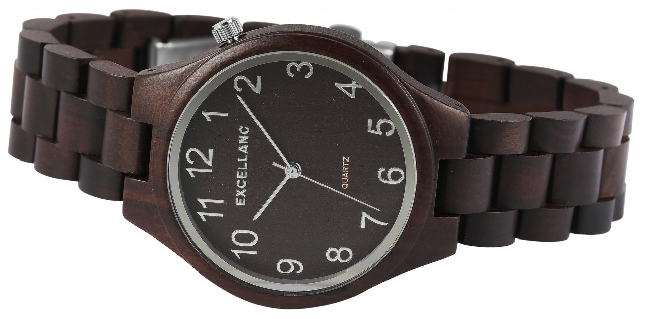 Die analoge 3-Zeiger Damenarmbanduhr der Marke Excellanc verfügt über ein hochwertiges Quarzuhrwerk. Das Holzarmband ist am Anstoß 8 mm breit und lässt sich mit einer Edelstahlfaltschließe öffnen und schließen. Die Gesamtlänge der Uhr beträgt 23,5 cm, lässt sich aber aufgrund der herausnehmen Elemente beliebig kürzen. Das ebenfalls aus Holz gefertigte Gehäuse mit gleichfarbigem Holzgehäuseboden und Mineralglas hat eine Abmessung von 38 mm im Durchmesser und einer Gehäusehöhe von 11 mm. Ein optisches Highlight ist das Mineralglas, welches am äußeren Rand einen Spiegelrand hat. Dieser verleiht der Uhr zusammen mit der farblich abgestimmten Krone auf zwei Uhr einen edlen Look. Das Zifferblatt ist ebenfalls aus Holz gefertigt. Die Zeiger und die Strichindexe passen sich farblich an und runden das Gesamtbild harmonisch…