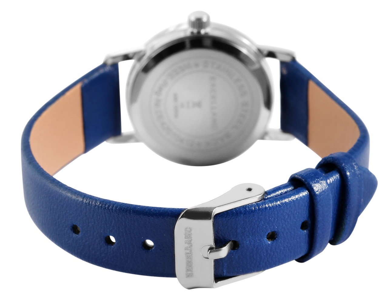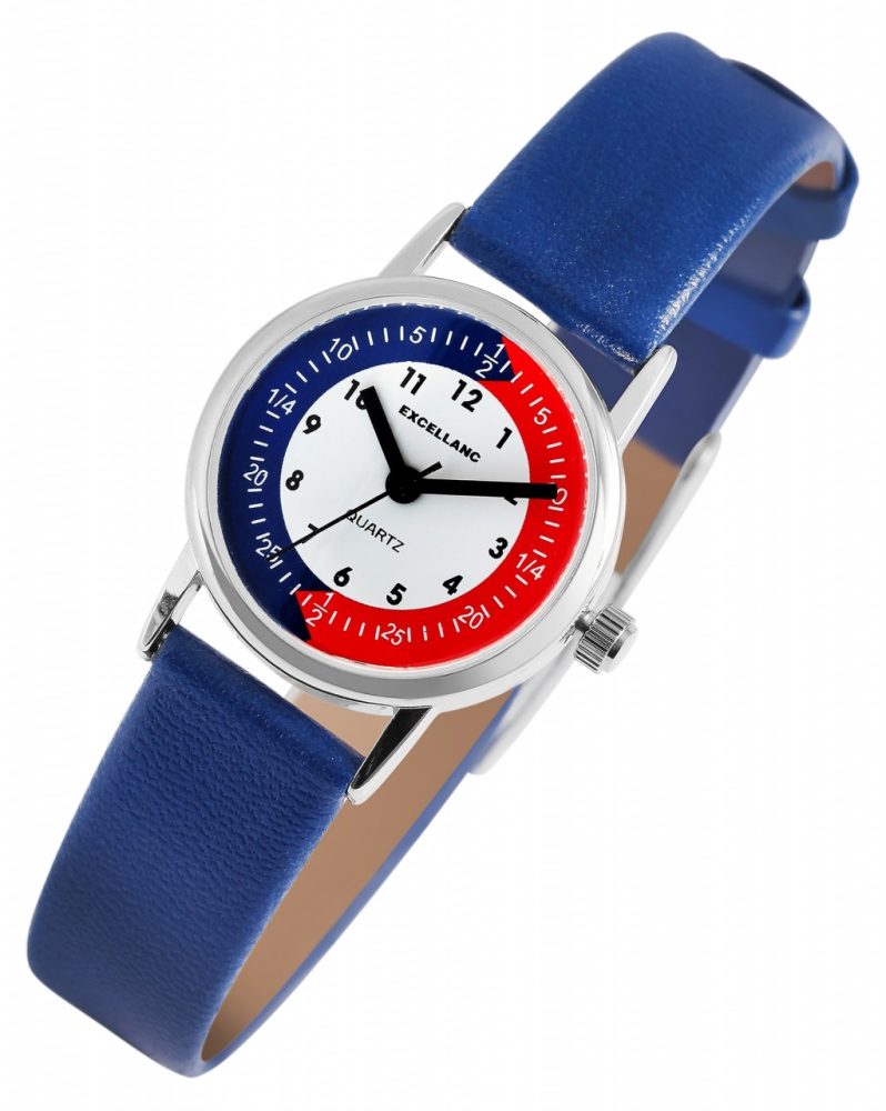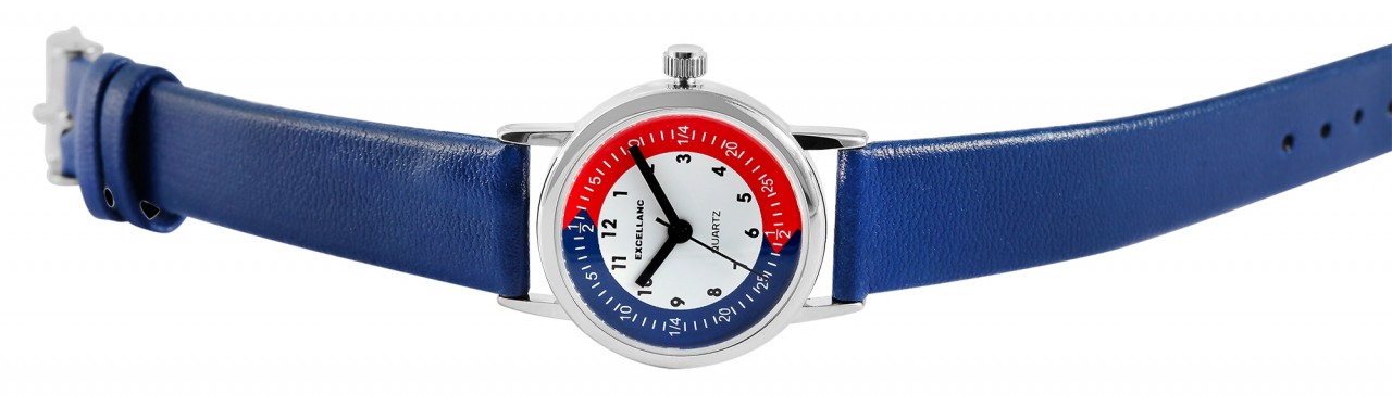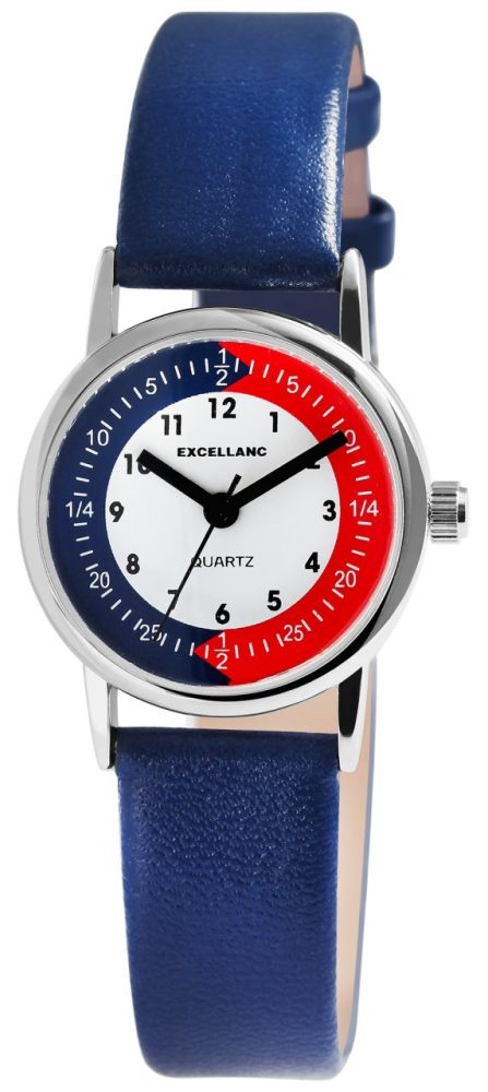 O relógio de pulso infantil analógico de 3 ponteiros da Excellanc possui um movimento de quartzo de alta qualidade. A bracelete de pele sintética tem 14 mm de largura na alça e pode ser aberta e fechada com uma fivela. O comprimento total do relógio é de 22 cm. A caixa de metal com vidro mineral tem um diâmetro de 26 mm e uma altura de 9 mm. O fundo da caixa é feito de aço inoxidável. A divisão clara e colorida do mostrador torna a leitura das horas uma brincadeira de criança e apoia de forma confiável as crianças na aprendizagem das horas.