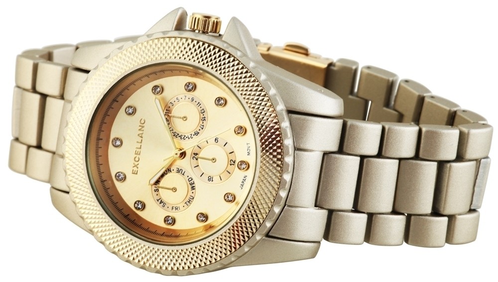 O relógio analógico feminino da Excellanc possui um movimento de quartzo de alta qualidade. A pulseira de metal tem 23 mm de largura e abre com um fecho dobrável em aço inoxidável. O comprimento total é de 19 cm. A caixa de metal com vidro mineral tem dimensão de 45 mm e altura de caixa de 14 mm. A tampa da caixa é feita de aço inoxidável. O acabamento em cristal no mostrador também é um destaque visual.