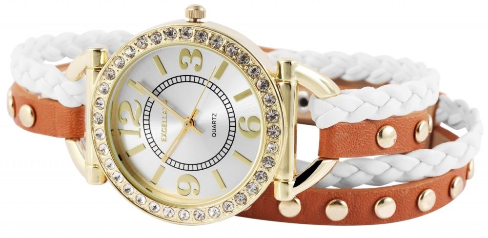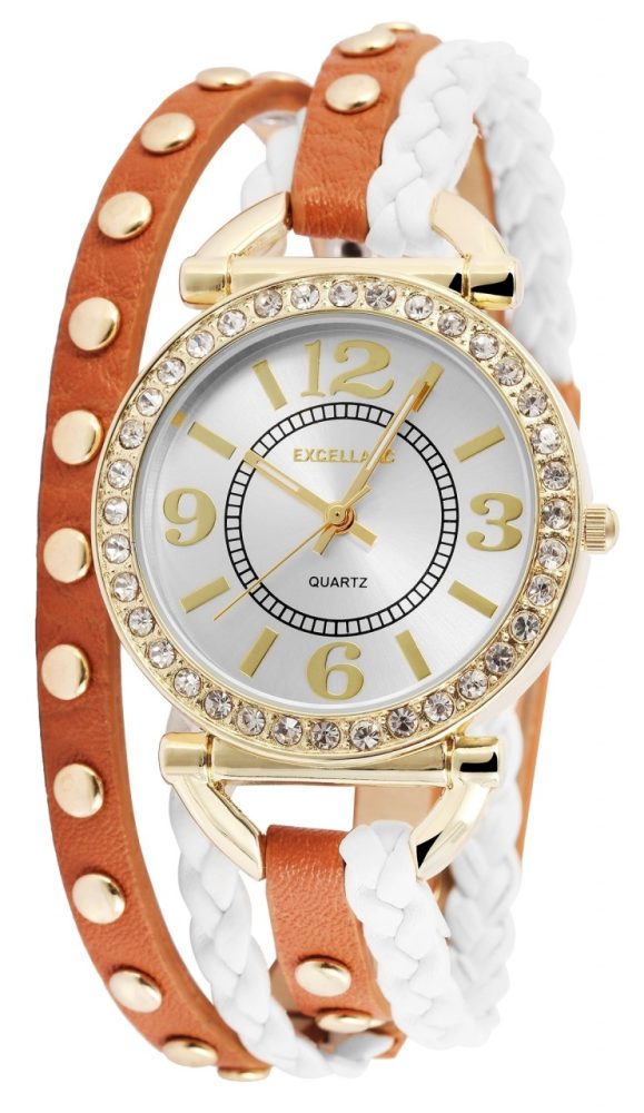 O relógio de pulso analógico de 3 ponteiros para senhora da Excellanc possui um movimento de quartzo de alta qualidade. A pulseira em imitação de pele é composta por duas tiras diferentes, uma delas trançada e a segunda lisa com tachas. Tem 12 mm de largura na alça e pode ser aberto e fechado com dois botões que podem ser ajustados em três posições diferentes. O comprimento total do relógio da moda é de 40 cm. A pulseira extra longa do relógio pode ser enrolada duas vezes no pulso e torna o relógio um atrativo muito especial. A caixa de metal com vidro mineral tem um diâmetro de 35 mm e uma altura de 7 mm. Um destaque visual é a luneta engastada com muitas pedras simili brilhantes, que conferem ao relógio um visual especial e o tornam um acessório indispensável em qualquer pulso.