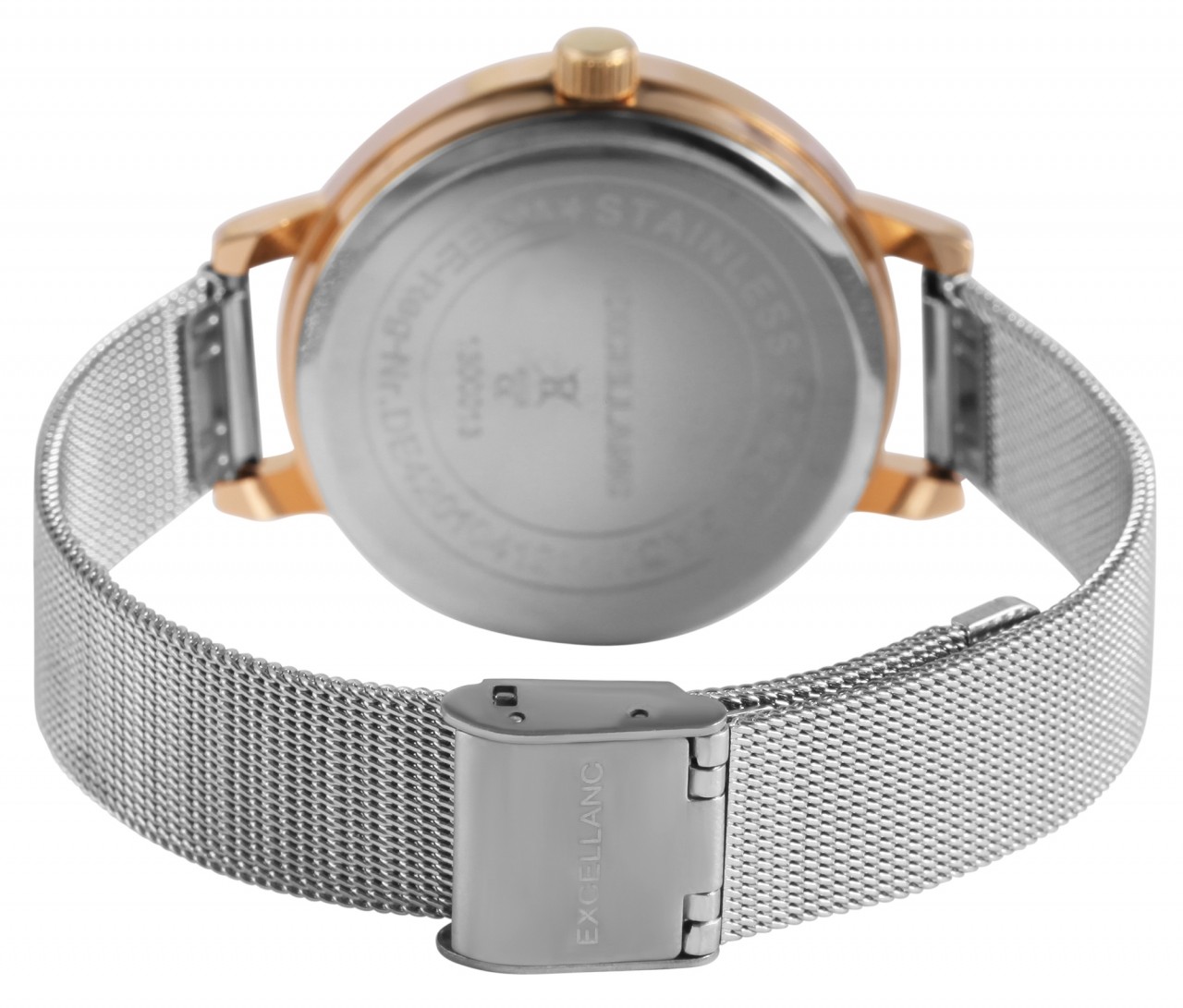 O relógio analógico de 3 ponteiros para senhora da Excellanc possui o movimento de quartzo PC21 de alta qualidade. A faixa de malha de aço inoxidável tem 14 mm de largura. Pode ser aberto e fechado com a ajuda de um fecho de gancho de aço inoxidável de fácil ajuste e o comprimento total do relógio é de 23 cm. A caixa de metal com vidro mineral tem um diâmetro de 38 mm e uma altura de 9 mm. O fundo da caixa prateado é feito de aço inoxidável. No mostrador há uma divisão de índice de linha em "3", "6", "9" e "12" horas e…