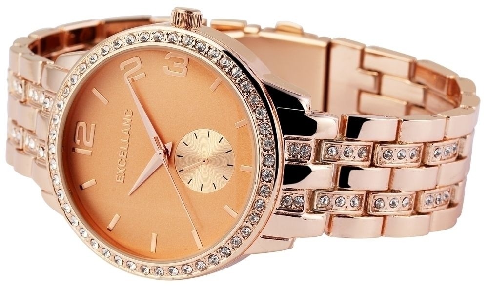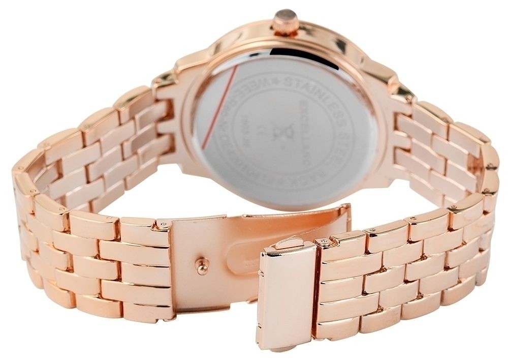 O relógio analógico feminino da Excellanc possui um movimento de quartzo de alta qualidade. O nome do modelo é EX0042. A pulseira de metal tem 20 mm de largura e abre com um fecho dobrável em aço inoxidável. O comprimento total é de 21 cm. A caixa de metal com vidro mineral tem dimensão de 41 mm e altura de caixa de 10 mm. O case é aprimorado com detalhes em cristal. A tampa da caixa é feita de aço inoxidável. Outra característica é: Chronolook.