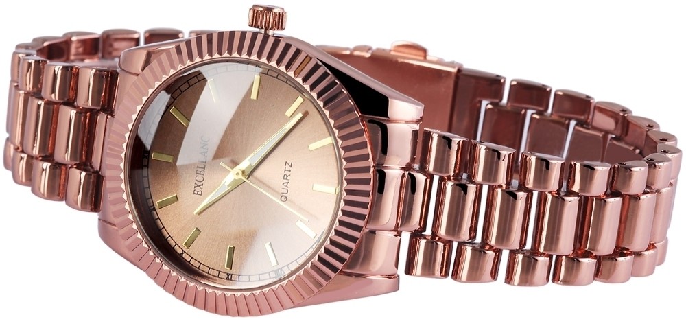 O relógio analógico feminino da Excellanc possui um movimento de quartzo de alta qualidade. A pulseira de metal tem 18 mm de largura e abre com um fecho dobrável em aço inoxidável. O comprimento total é de 20 cm. A caixa de metal com vidro mineral tem dimensão de 37 mm e altura de caixa de 12 mm. A tampa da caixa é feita de aço inoxidável.