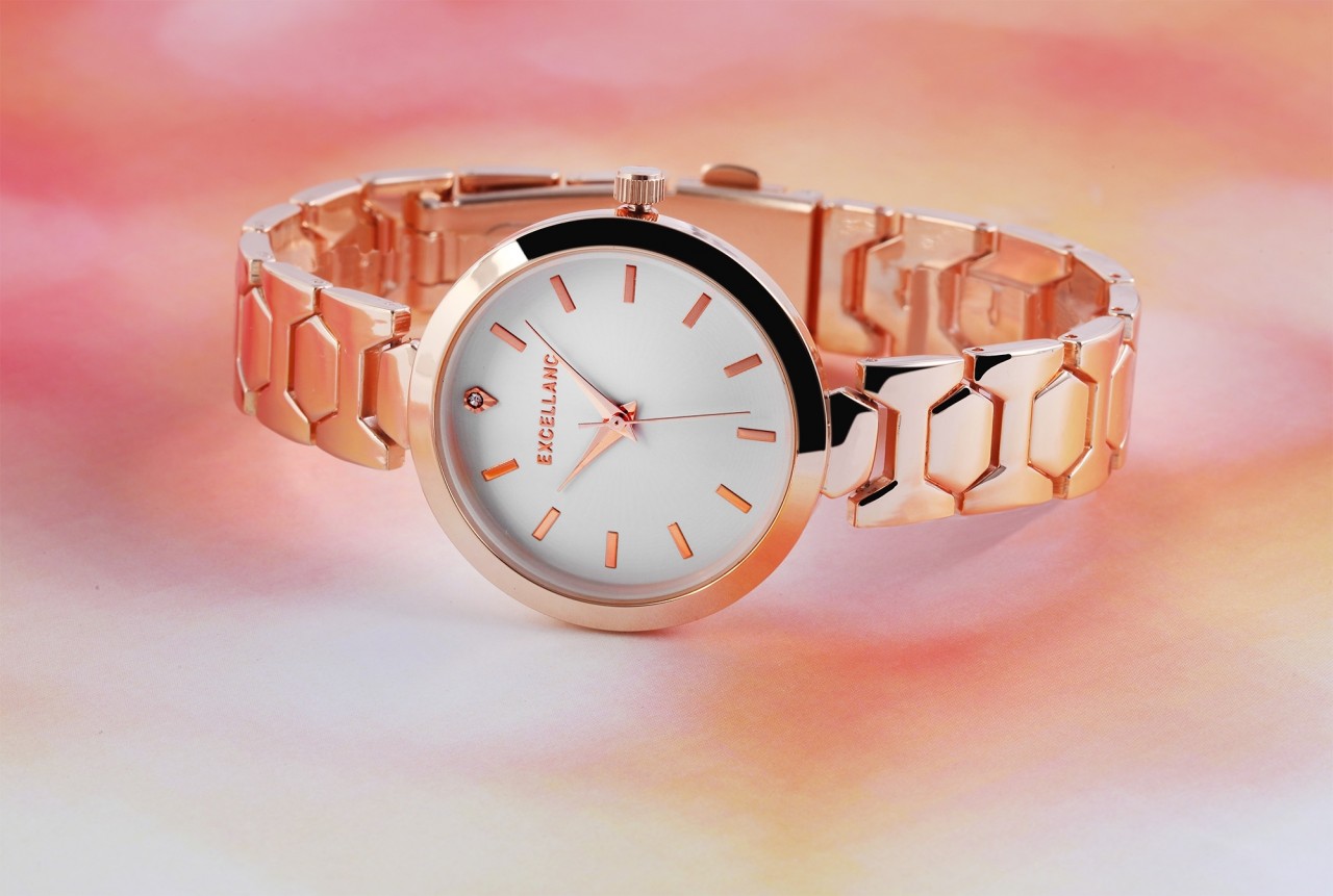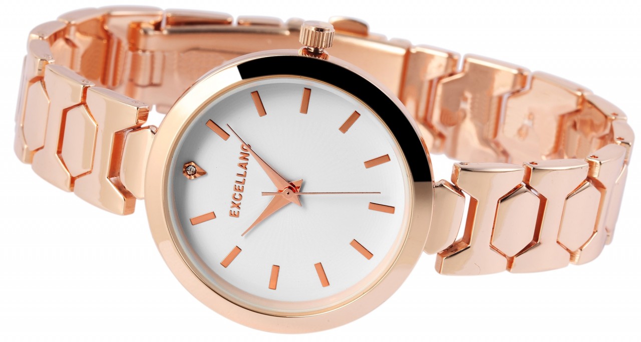 O relógio analógico feminino da Excellanc possui um Japan PC21. O nome do modelo é EX0186. A pulseira de metal tem 14 mm de largura e abre com um fecho dobrável em aço inoxidável. O comprimento total é de 18 cm. A caixa de metal com vidro mineral tem dimensão de 34 mm e altura de caixa de 8 mm. A tampa da caixa é feita de aço inoxidável. O acabamento em cristal no mostrador também é um destaque visual.