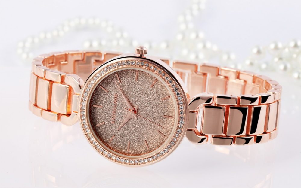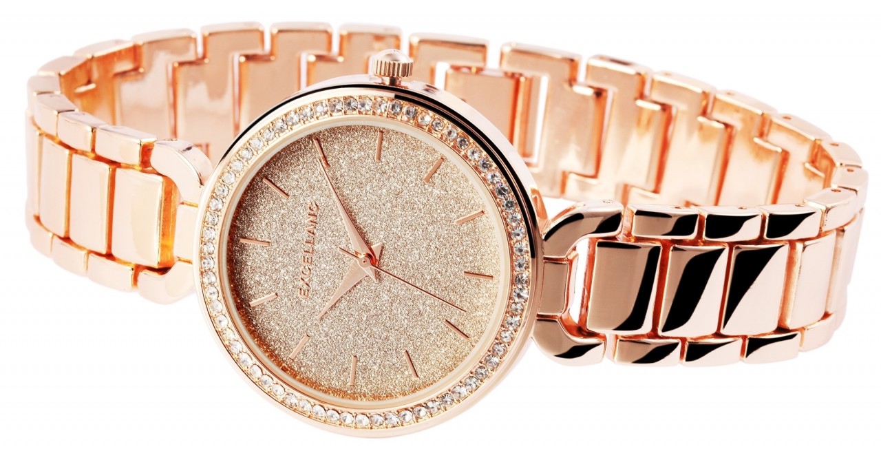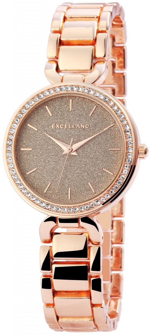 O relógio analógico feminino da Excellanc possui um Japan PC21. O nome do modelo é EX0214. A pulseira de metal tem 16 mm de largura e abre com um fecho de clipe. O comprimento total é de 17,5 cm. A caixa de metal com vidro mineral tem dimensão de 35 mm e altura de caixa de 8 mm. O case é aprimorado com detalhes em cristal. A tampa da caixa é feita de aço inoxidável. O acabamento em cristal no mostrador também é um destaque visual.