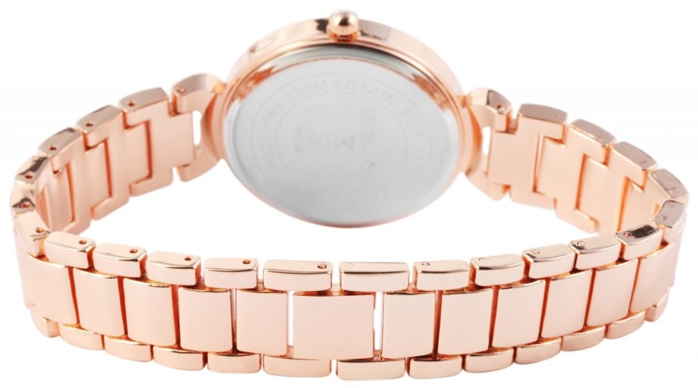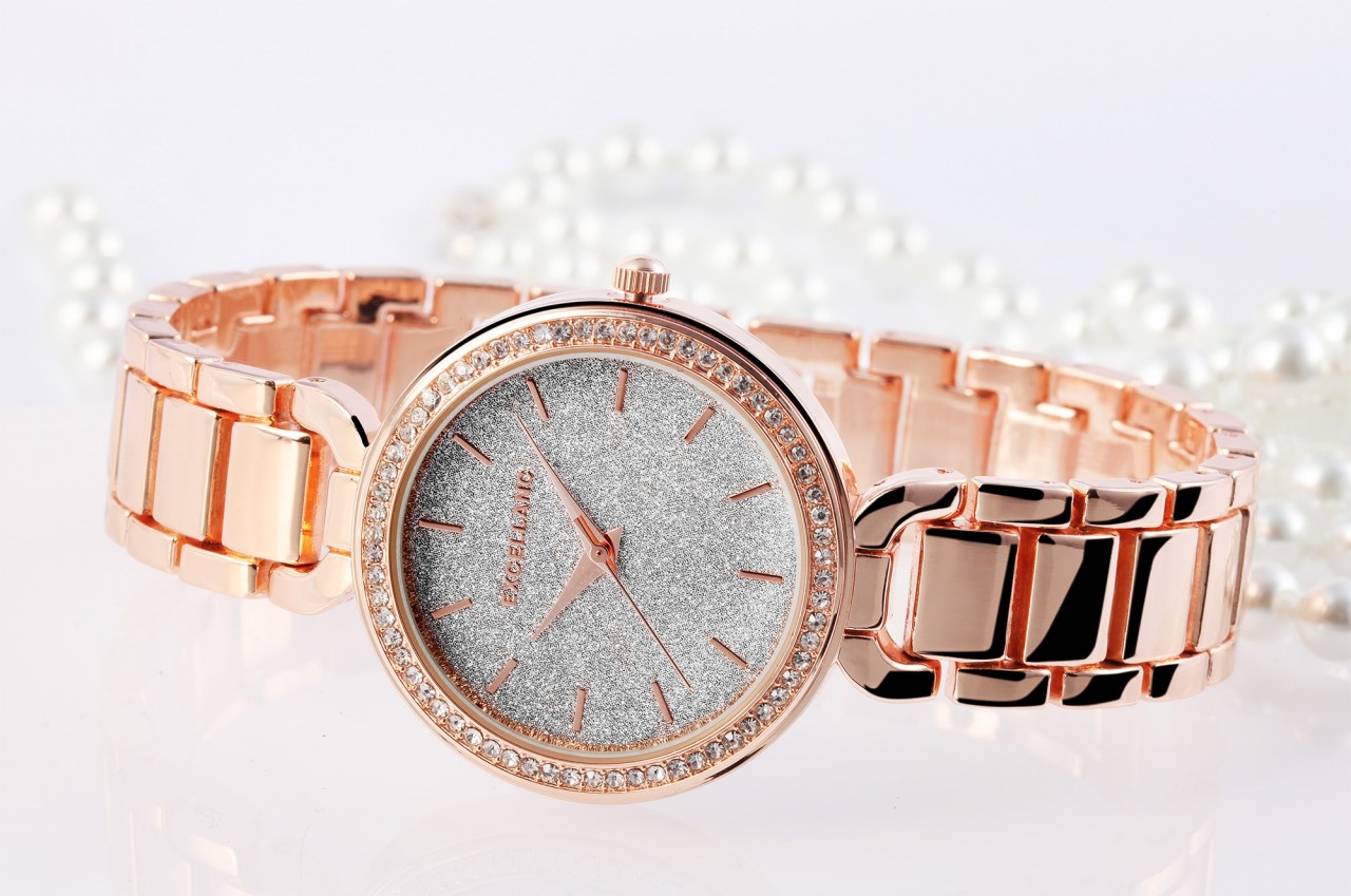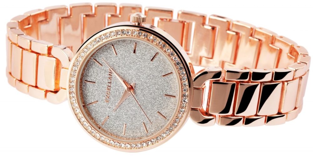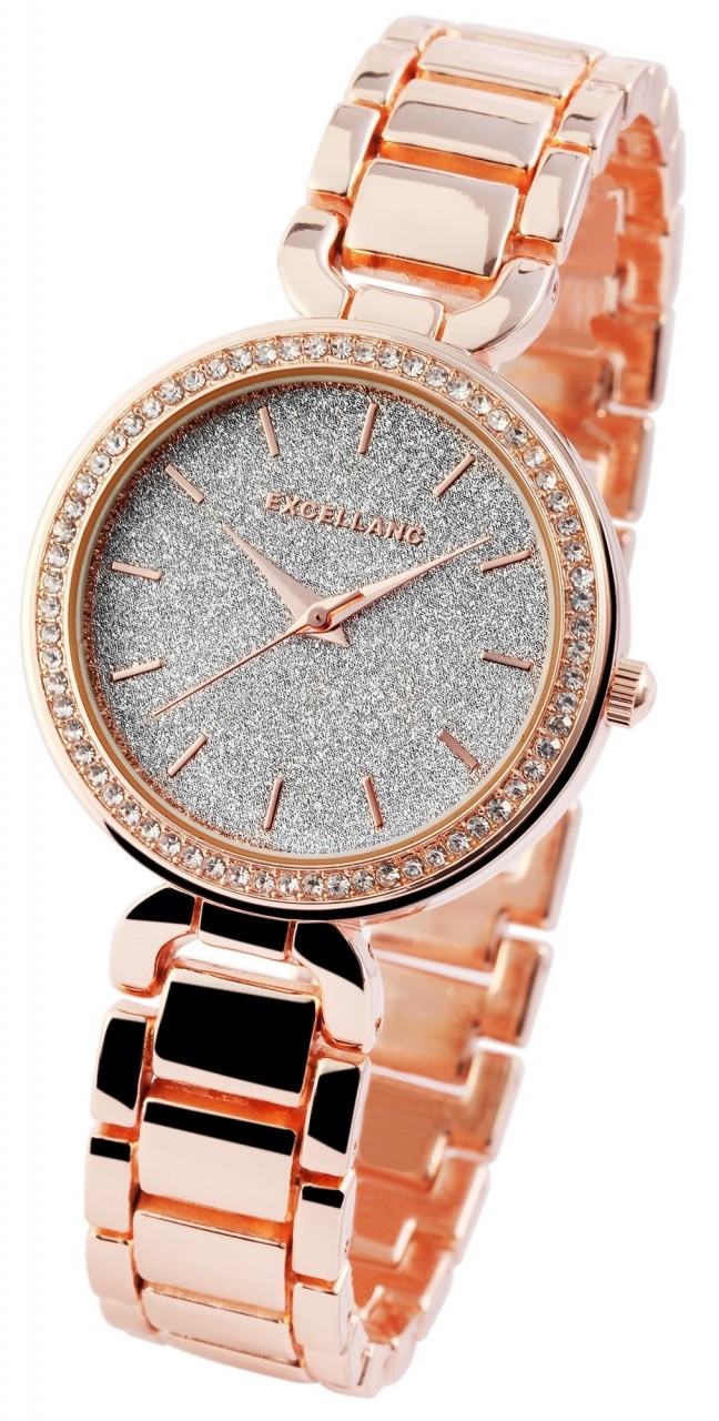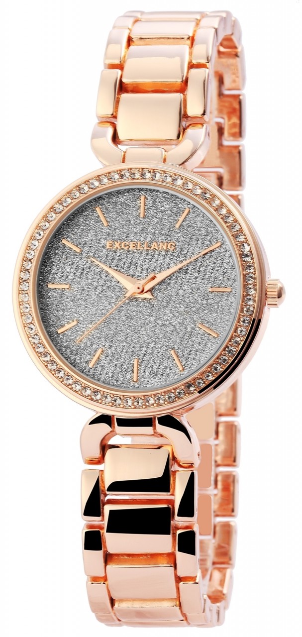 O relógio analógico feminino da Excellanc possui um Japan PC21. O nome do modelo é EX0214. A pulseira de metal tem 16 mm de largura e abre com um fecho de clipe. O comprimento total é de 17,5 cm. A caixa de metal com vidro mineral tem dimensão de 35 mm e altura de caixa de 8 mm. O case é aprimorado com detalhes em cristal. A tampa da caixa é feita de aço inoxidável. O acabamento em cristal no mostrador também é um destaque visual.