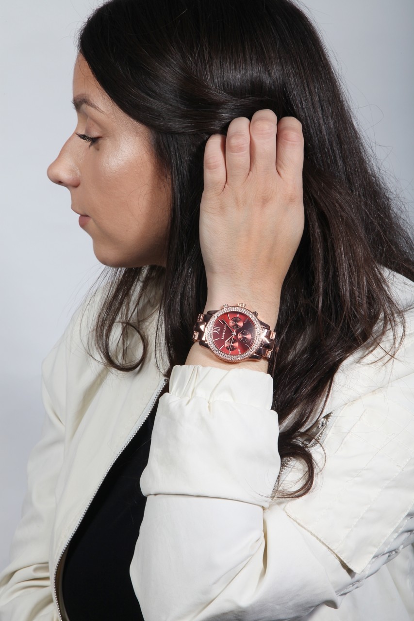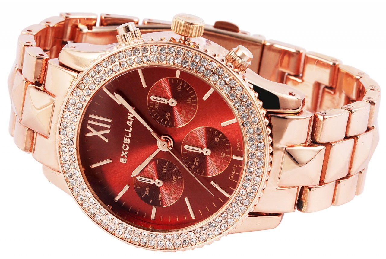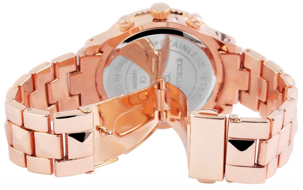 O relógio analógico feminino da Excellanc possui um movimento de quartzo de alta qualidade. A pulseira de metal tem 20 mm de largura e abre com um fecho dobrável em aço inoxidável. O comprimento total é de 17,5 cm. A caixa de metal com vidro mineral tem dimensão de 40 mm e altura de caixa de 12 mm. O case é aprimorado com detalhes em cristal. A tampa da caixa é feita de aço inoxidável. Outra característica é: Chronolook.