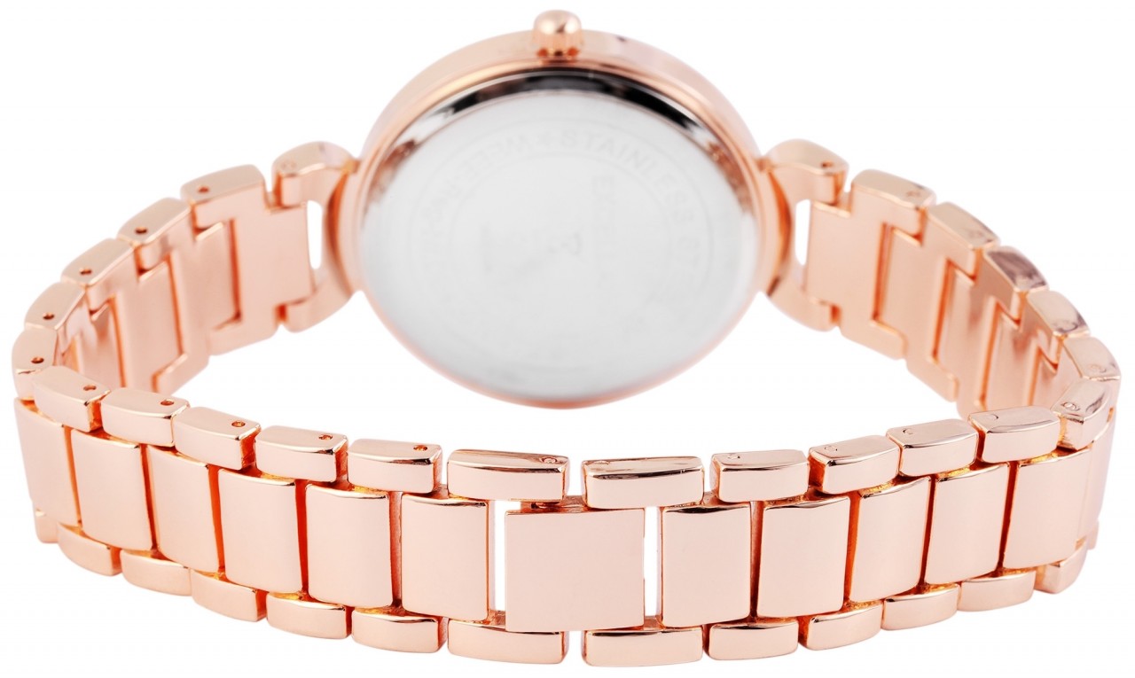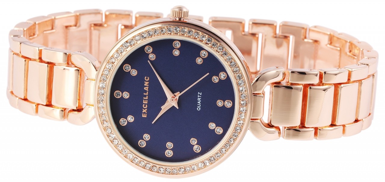 Die Analog Damenuhr der Marke Excellanc verfügt über ein Japan PC21. Die Modellbezeichnung ist EX0216. Das Metallarmband ist 16 mm breit und wird mit einer Clipverschluss geöffnet. Die Gesamtlänge beträgt 18 cm. Das Metallgehäuse mit Mineralglas hat eine Abmessung von 35 mm und 8 mm Gehäusehöhe. Aufgewertet wird das Gehäuse mit Crystal-Besatz. Der Gehäusedeckel ist aus Edelstahl gefertigt. Ein optisches Highlight ist auch der Crystal-Besatz auf dem Zifferblatt.
