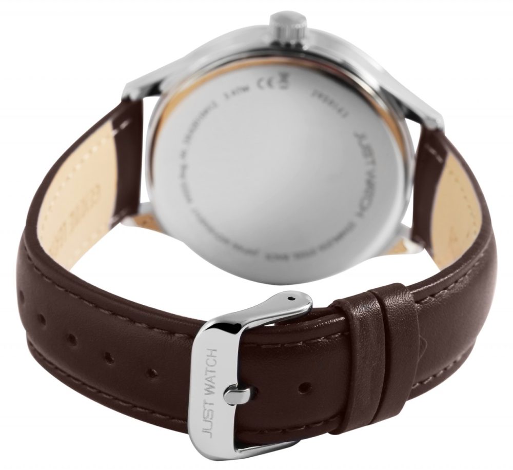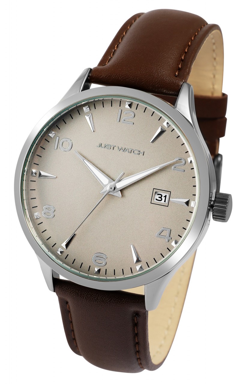 O relógio de pulso analógico masculino de 3 ponteiros da Just Watch possui um movimento de quartzo de alta qualidade. A pulseira de couro genuíno tem 20 mm de largura na alça e pode ser aberta e fechada com uma fivela de aço inoxidável. O comprimento total do relógio é de 26,5 cm. A caixa de metal com vidro mineral tem um diâmetro de 42 mm e uma altura de 12 mm. O fundo da caixa é feito de aço inoxidável e o relógio tem resistência à água de 3 bar. O mostrador é simples e claramente projetado. Os ponteiros e índices combinam com a cor da caixa e, assim, completam harmoniosamente o quadro geral. Outra particularidade é a exibição da data às três horas e os ponteiros revestidos com Superluminova, que permitem a leitura das horas mesmo no escuro. Como acessórios do seu produto, você receberá um cartão de garantia e uma caixa original da marca Just Watch.