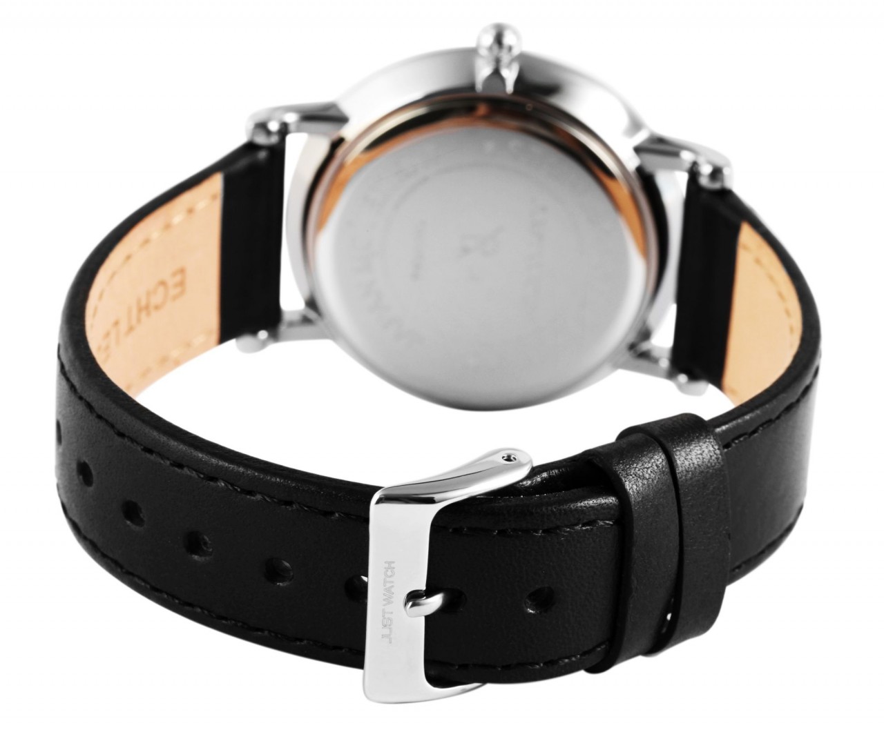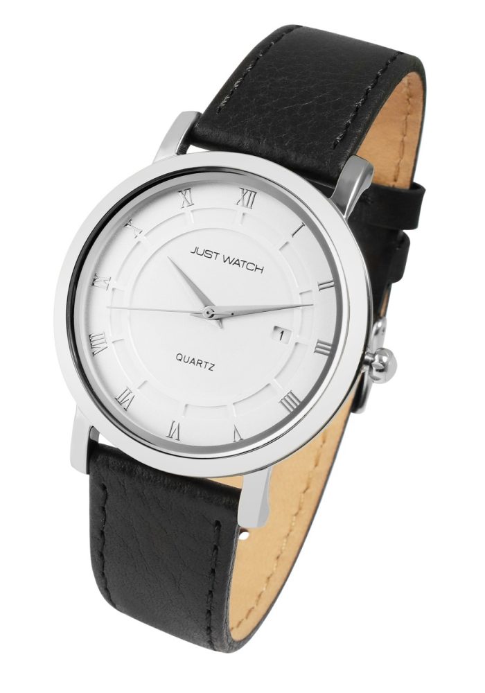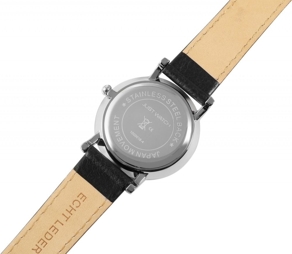 O relógio analógico masculino da Just Watch possui um Miyota GM10. A pulseira de couro genuíno tem 20 mm de largura e abre com uma fivela de aço inoxidável. O comprimento total é de 20 cm. A caixa de metal com vidro mineral tem dimensão de 40 mm e altura de caixa de 8 mm. A tampa da caixa é feita de aço inoxidável. O relógio masculino Just Watch possui os seguintes recursos: Exibição de data. Caixa original