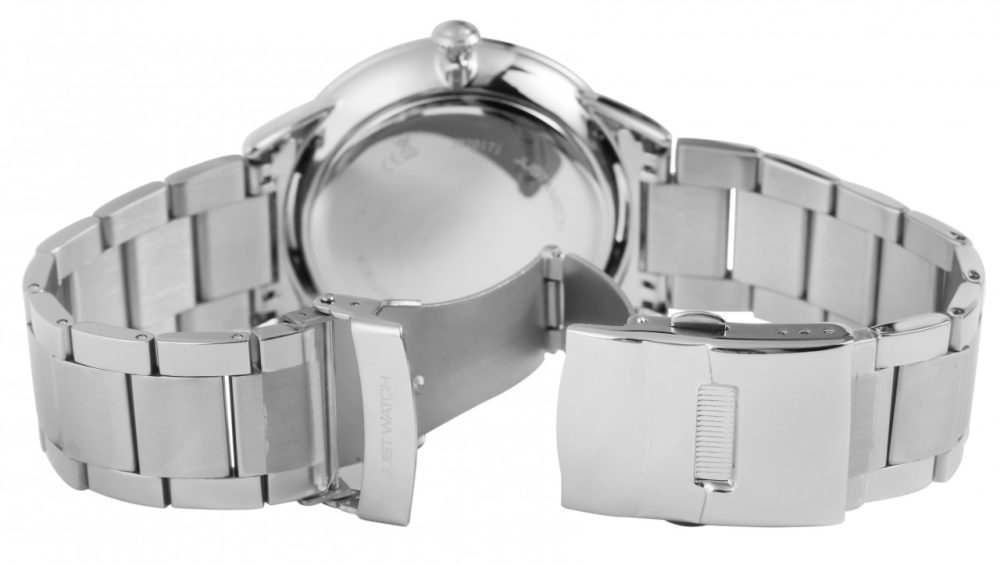 O relógio de pulso masculino analógico de 3 ponteiros da Just Watch possui o movimento de quartzo Miyota 2315 de alta qualidade. A pulseira de aço inoxidável tem 22 mm de largura na alça e pode ser aberta e fechada com um fecho dobrável de aço inoxidável. O comprimento total do relógio é de 23,5 cm. A caixa de metal com vidro mineral tem um diâmetro de 42 mm e uma altura de 10 mm. O fundo da caixa é feito de aço inoxidável e o relógio tem resistência à água de 3 bar. A divisão do mostrador é simples e os ponteiros e índices têm a mesma cor da caixa. O relógio também possui uma exibição de data às seis horas. Como acessórios do seu produto, você receberá um cartão de garantia e uma caixa original da marca Just Watch.