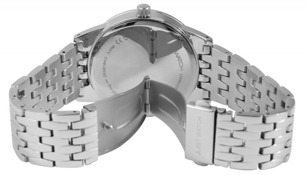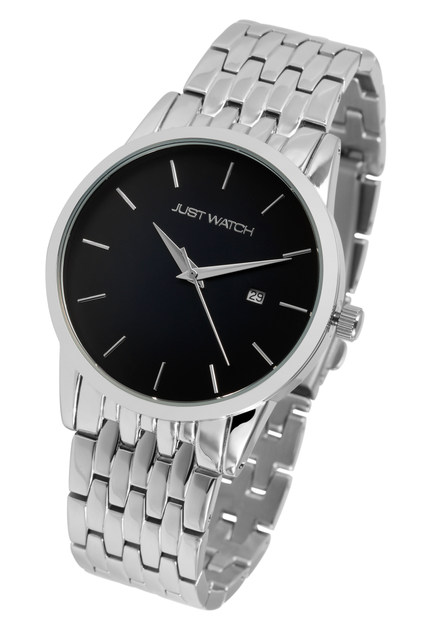 O relógio de pulso unissex analógico de 3 ponteiros da Just Watch possui o movimento de quartzo Miyota 2035 de alta qualidade. A pulseira de aço inoxidável tem 22 mm de largura na alça e pode ser aberta e fechada com um fecho dobrável de aço inoxidável. O comprimento total do relógio é de 22 cm. A caixa de metal com vidro mineral tem um diâmetro de 42 mm e uma altura de 10 mm. O fundo da caixa é feito de aço inoxidável e o relógio tem resistência à água de 3 bar. A divisão do mostrador é simples e os ponteiros e índices têm a mesma cor da caixa. O relógio também possui uma exibição de data às três horas. Como acessórios do seu produto, você receberá um cartão de garantia e uma caixa original da marca Just Watch.