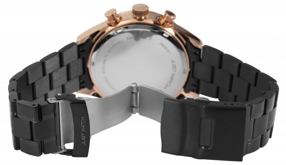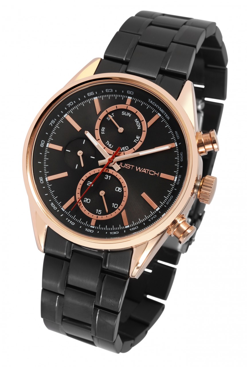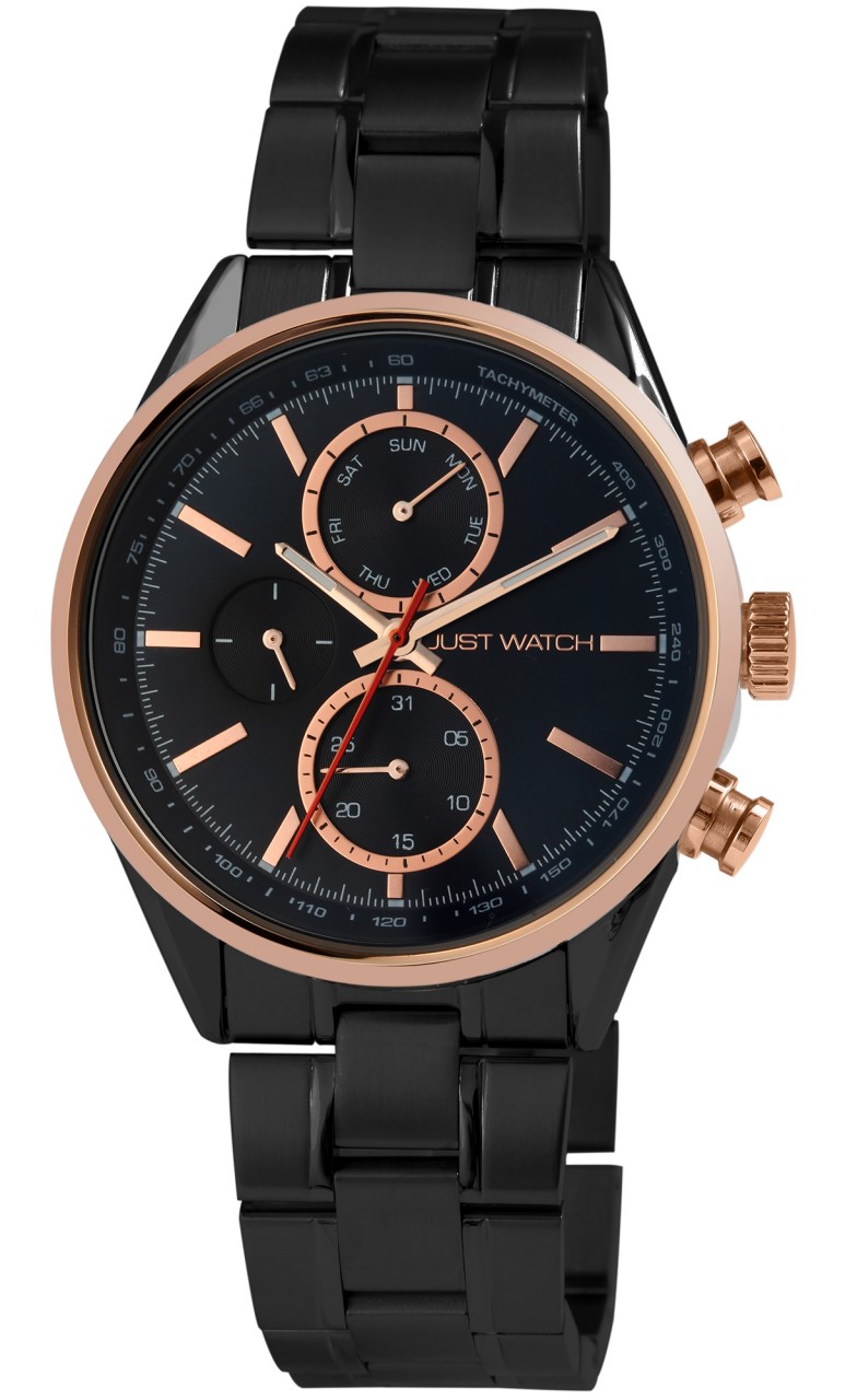 O relógio de pulso analógico masculino de 3 ponteiros da Just Watch possui um movimento de quartzo de alta qualidade. A pulseira de aço inoxidável tem 22 mm de largura na alça e pode ser aberta e fechada com um fecho dobrável com barra de segurança. O comprimento total do relógio é de 24,5 cm. A caixa de metal com vidro mineral tem um diâmetro de 44 mm e uma altura de 11 mm. O relógio também possui exibição de 24 horas, exibição de data e exibição do dia da semana. Graças aos ponteiros revestidos com Superluminova, a hora também pode ser lida no escuro.