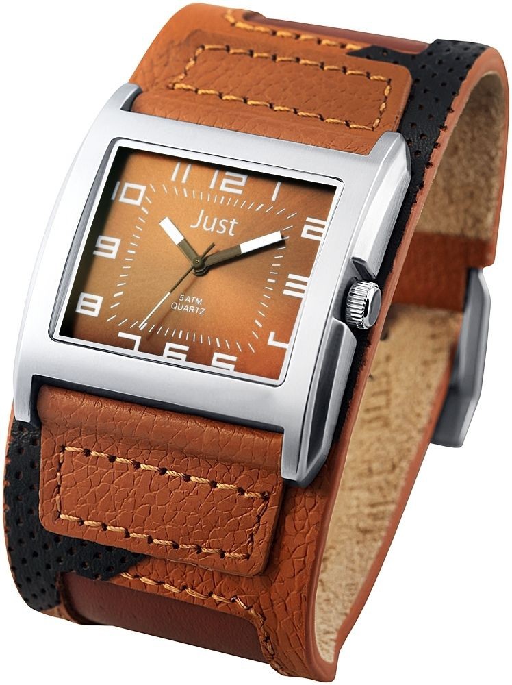 O relógio de pulso masculino analógico da Just Watch possui um movimento de quartzo de alta qualidade. A bracelete de pele genuína tem uma largura de 42 mm e pode ser aberta e fechada com um fecho de gancho. O comprimento total do relógio é de 23 cm. A caixa de metal com vidro mineral tem 42 de Largura, e uma altura de 9 mm. O fundo da caixa é feito de aço inoxidável e o relógio tem resistência à água de 5 ATM.