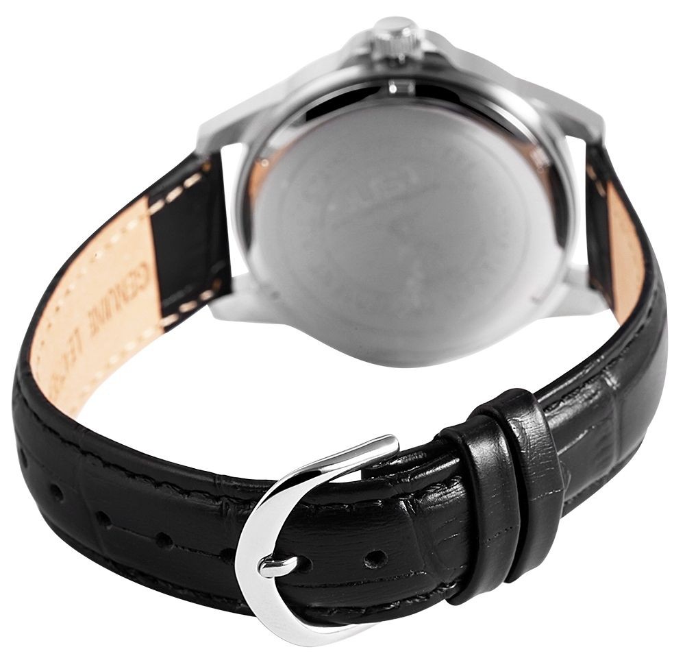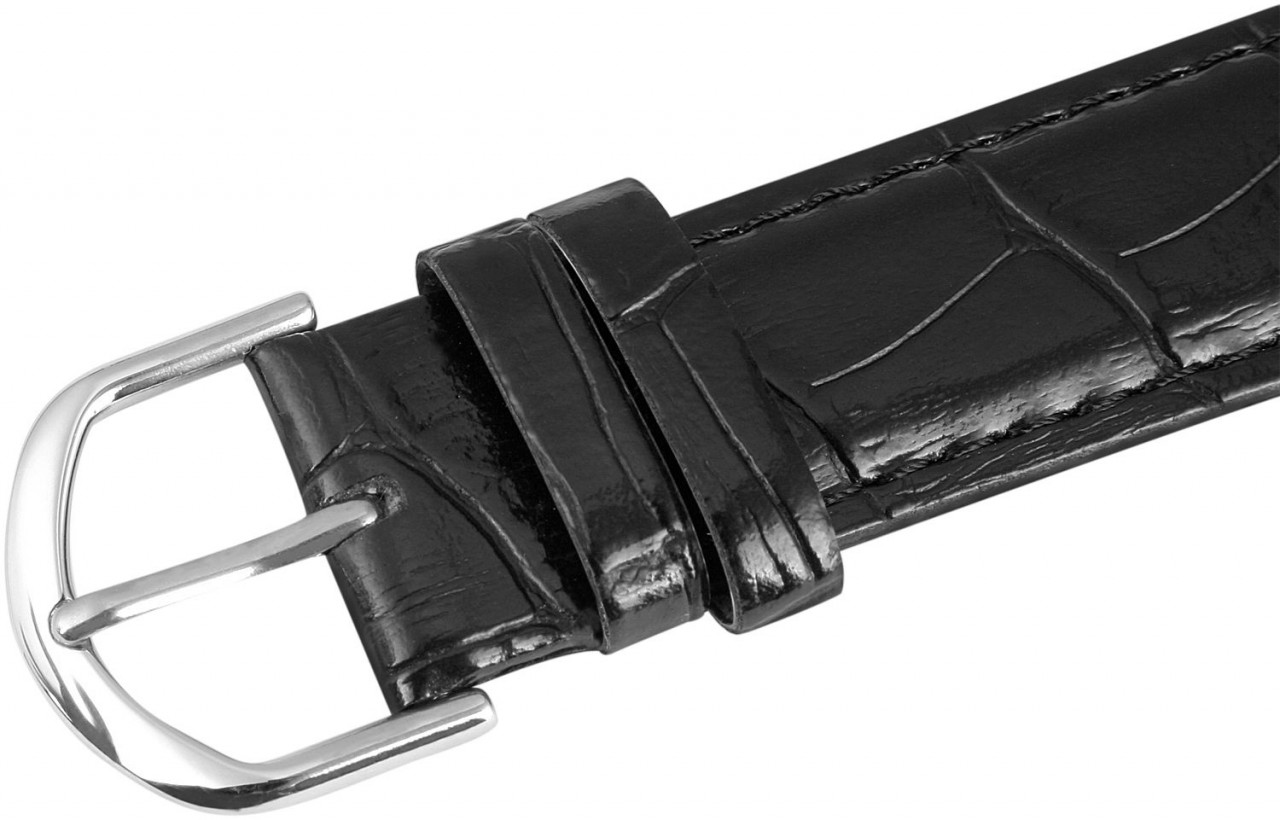 A pulseira é feita de pele genuína e tem uma largura de 18 mm. É aberto e fechado com uma fivela de aço inoxidável. O comprimento total do relógio é de 24 cm.