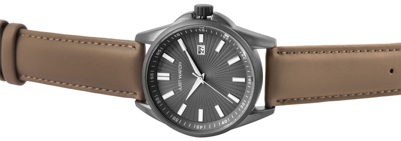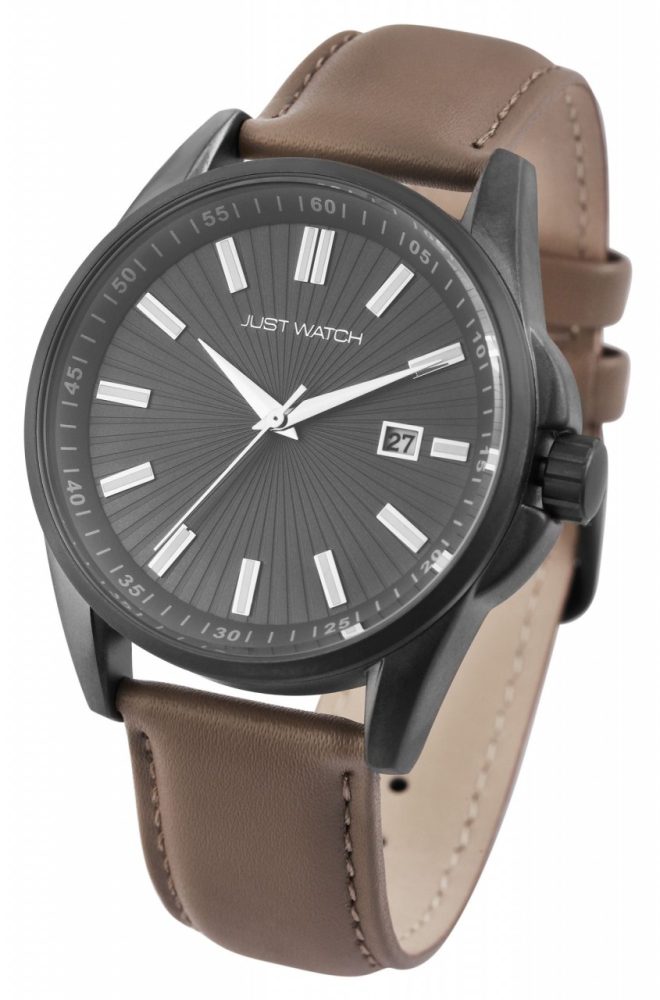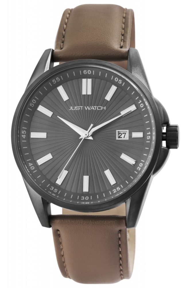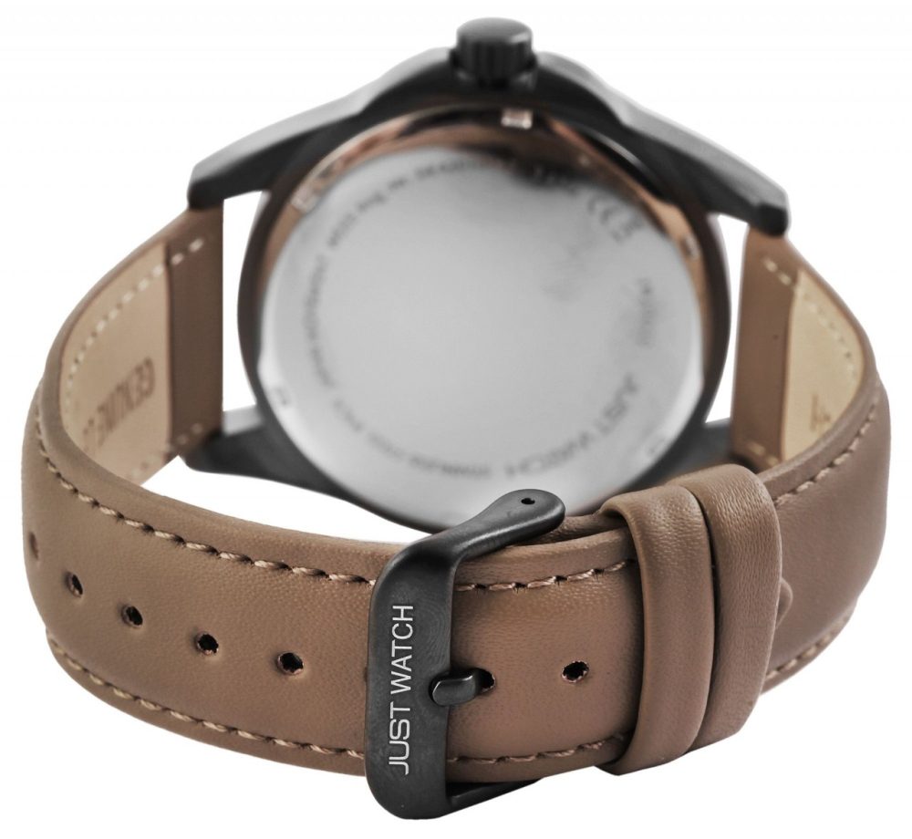 O relógio analógico masculino da Just Watch tem um Miyota 2315. A pulseira de couro genuíno tem 22 mm de largura e abre com uma fivela. O comprimento total é de 24 cm. A caixa de metal com vidro mineral tem dimensão de 45 mm e altura de caixa de 12 mm. A tampa da caixa é feita de aço inoxidável. O relógio masculino Just Watch possui os seguintes recursos: Exibição de data.