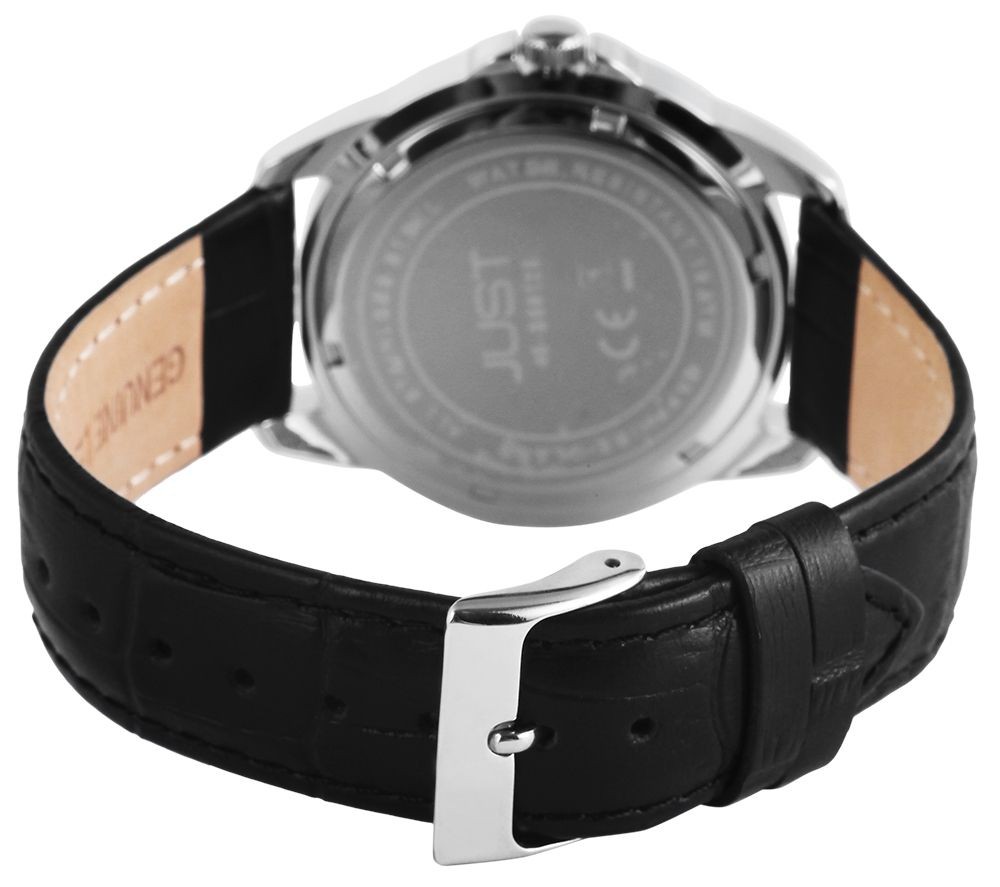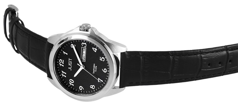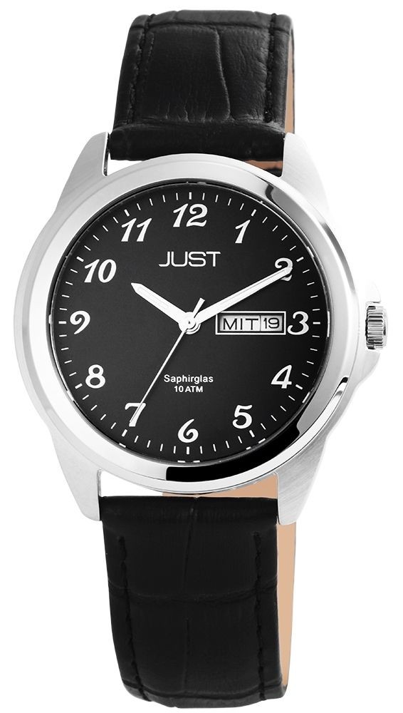 O relógio de pulso masculino analógico de 3 ponteiros da Just possui um movimento de quartzo preciso e de alta qualidade da Miyota. A pulseira em couro genuíno com relevo tem 20 mm de largura nas alças e pode ser aberta e fechada com uma fivela de aço inoxidável. A pulseira acolchoada garante um ajuste confortável e é perfeita para quem sofre de alergias devido à matéria-prima natural. O comprimento total do relógio é de 24 cm. A caixa de aço inoxidável com cristal de safira tem um diâmetro de 40 mm e uma altura de 10 mm. A hora pode ser facilmente lida graças ao mostrador simples com números em estilo árabe. Além da hora, a data atual e o dia da semana também são exibidos às três horas. O fundo da caixa também é feito de aço inoxidável e o relógio tem resistência à água de 10 bar.
