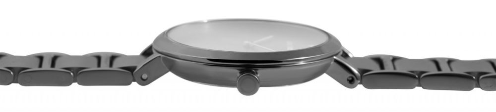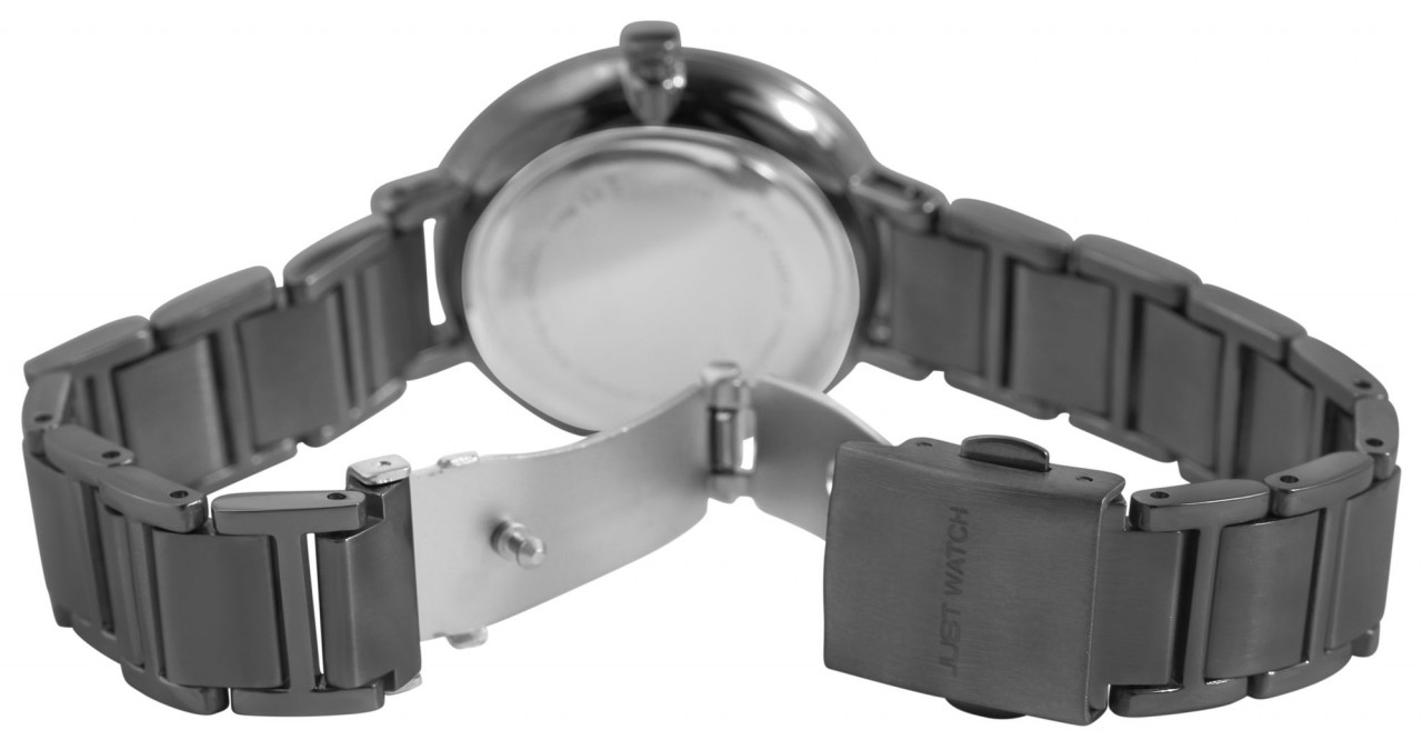 A pulseira de aço inoxidável tem 11mm de largura e abre com uma fivela.