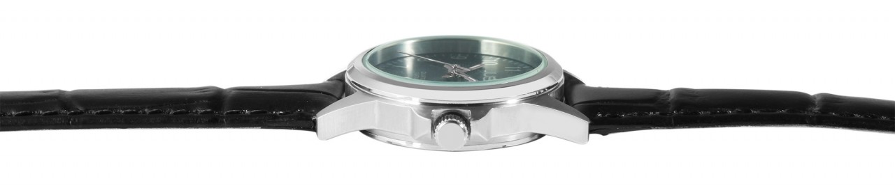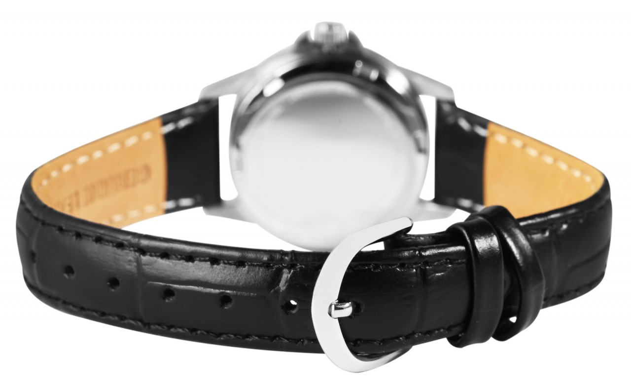 A pulseira em relevo é feita de couro genuíno e tem uma largura de 14 mm. É aberto e fechado com uma fivela de aço inoxidável. O comprimento total do relógio é de 22 cm.