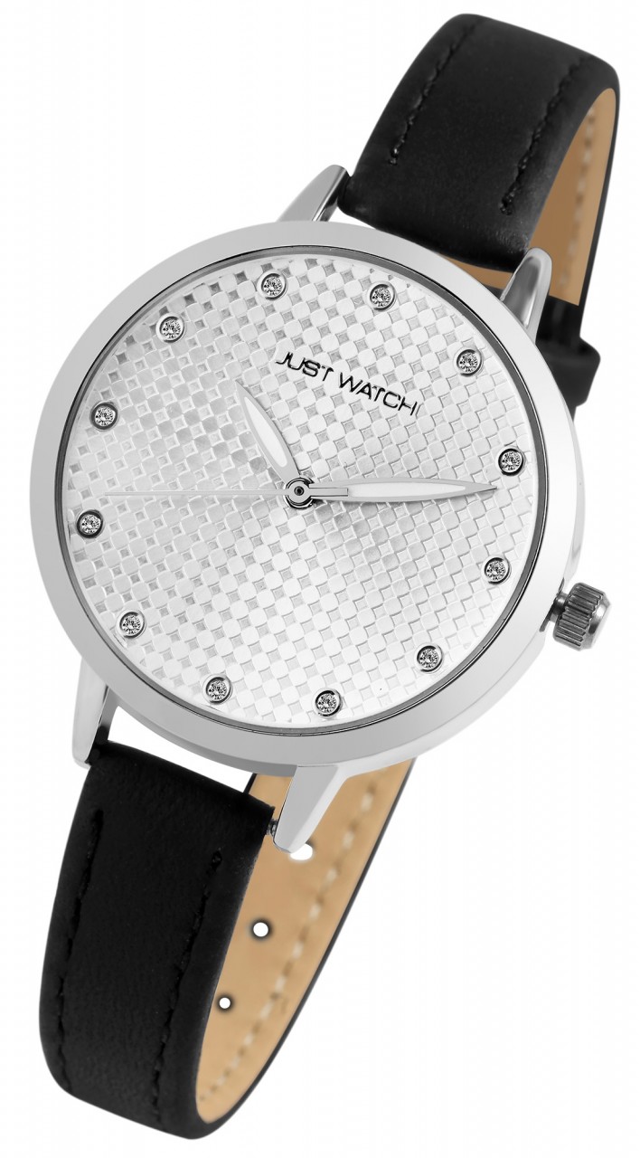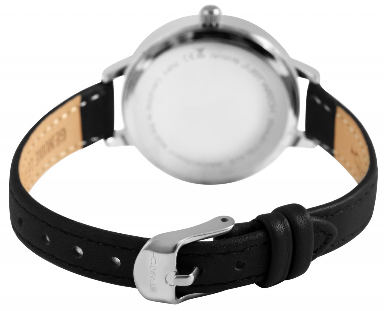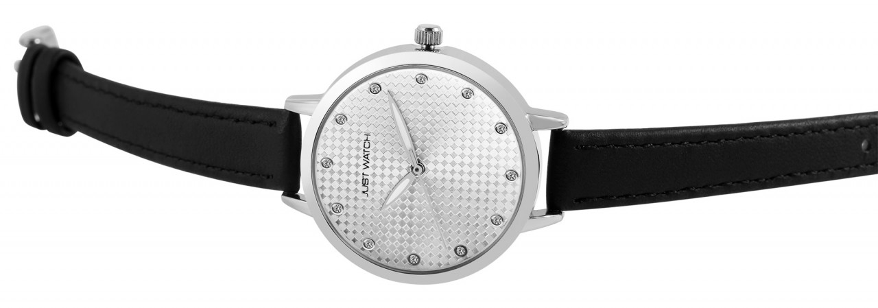 O relógio de pulso feminino analógico de 3 ponteiros da marca Just Watch possui o movimento de quartzo Miyota 2035 de alta qualidade e preciso. A pulseira de couro tem 12 mm de largura na alça e afunila em 2 mm, de modo que a alça do fecho tem 10 mm. O relógio clássico pode ser aberto e fechado com uma fivela. O comprimento total é de 24 cm. A caixa de metal com vidro mineral tem um diâmetro de 34 mm e uma altura de 10 mm. O fundo da caixa é feito de aço inoxidável. Um destaque visual é o mostrador estampado, no qual pedras brilhantes aparecem na hora e servem como índices de pontos. Graças aos ponteiros revestidos com Superluminova, as horas podem ser lidas mesmo no escuro. A caixa do relógio, os ponteiros e os índices são da mesma cor e completam completamente o design do relógio feminino.