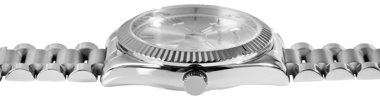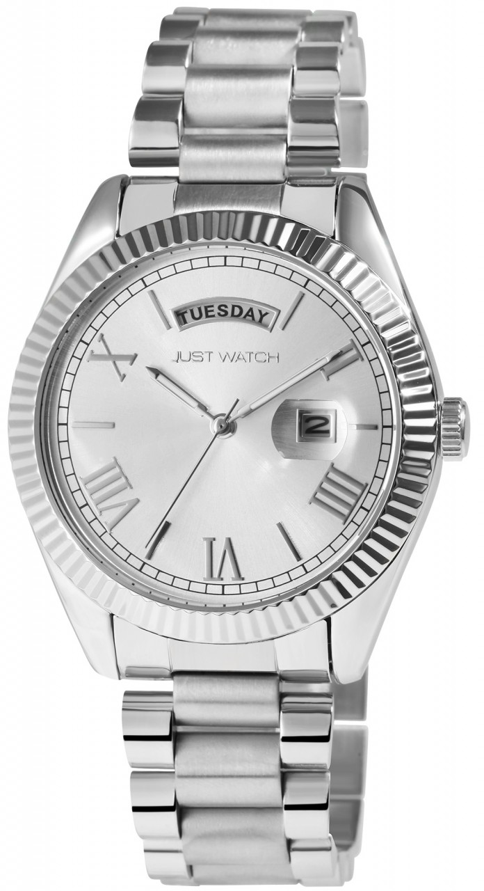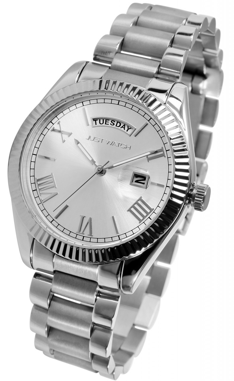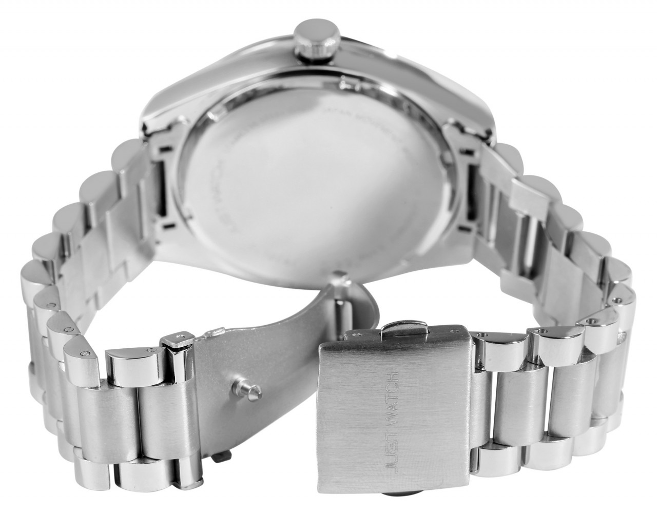 O relógio de pulso analógico masculino de 3 ponteiros da Just Watch possui um movimento de quartzo de alta qualidade. A pulseira de elos de aço inoxidável tem 20 mm de largura nas alças e pode ser aberta e fechada com um fecho dobrável de aço inoxidável. O comprimento total do relógio é de 22 cm. A caixa de metal com vidro mineral tem um diâmetro de 41 mm e uma altura de 12 mm. O relógio também possui exibição dos dias da semana entre onze e uma hora e exibição da data às três horas, que também é equipada com uma lupa no vidro. O fundo da caixa é feito de aço inoxidável e o relógio masculino é resistente à água até 3 bar. Os ponteiros revestidos com Superluminova facilitam a leitura das horas mesmo no escuro. Outro destaque deste relógio é a luneta marcante, que acrescenta detalhes de moda ao modelo.