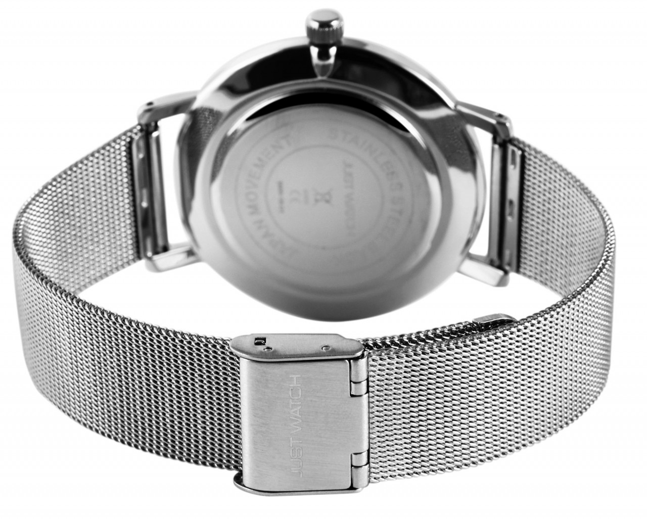 O relógio analógico feminino da Just Watch tem um Miyota 2035. A pulseira tem 20 mm de largura e o comprimento total é de 19 cm. A caixa de metal com vidro mineral tem dimensão de 42 mm e altura de caixa de 12 mm. A tampa da caixa é feita de aço inoxidável. Caixa original