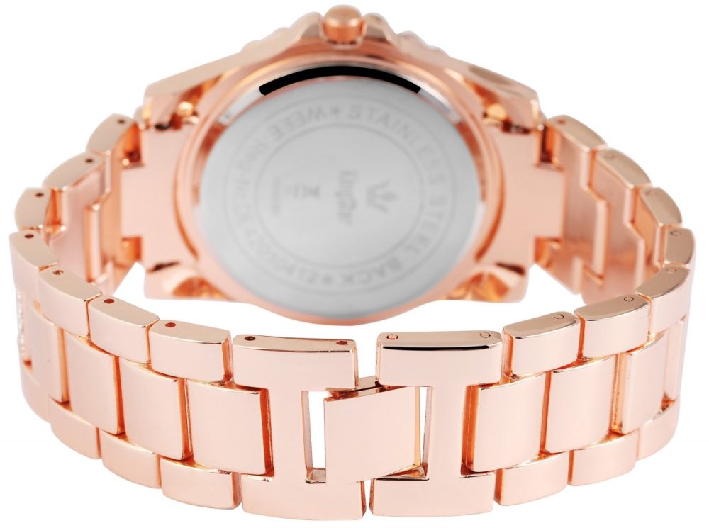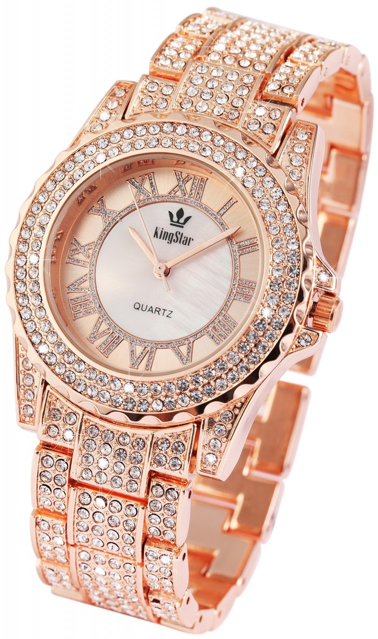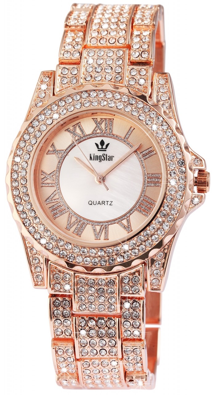 O relógio analógico feminino da marca King Star tem um PC21 do Japão. A designação do modelo é KS0001. A bracelete metálica tem 20 mm de largura e abre com um fecho de clipe. O comprimento total é de 16 cm. A caixa de metal com vidro mineral mede 38 mm e tem 9 mm de altura. A caixa é realçada por um friso de cristal. A tampa da caixa é feita de aço inoxidável. O friso de cristal no mostrador é também um destaque visual.