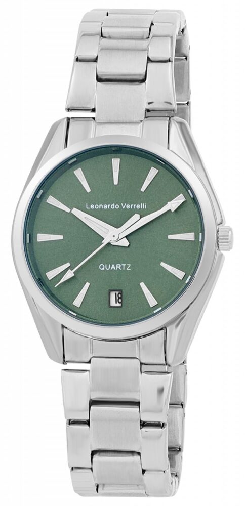 Um elegante relógio feminino da Leonardo Verrelli que impressiona pelo seu design simples e moderno. A caixa de metal com parte traseira de aço inoxidável tem um diâmetro de 34 mm e é complementada por uma pulseira de elos de aço inoxidável, que é presa ao pulso com um fecho prático de borboleta. O comprimento total do relógio é de 20 cm. O mostrador com índice de linha e um prático visor de data na posição de 6 horas são protegidos por um vidro mineral durável. O revestimento luminoso nos índices e ponteiros das linhas garante uma boa legibilidade das horas, mesmo em condições de pouca iluminação. O relógio é alimentado por um confiável movimento de quartzo SL 25 que garante cronometragem precisa. Disponível em muitas variações de cores, este relógio oferece a escolha certa para todos os gostos.