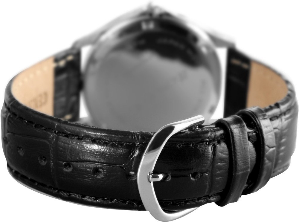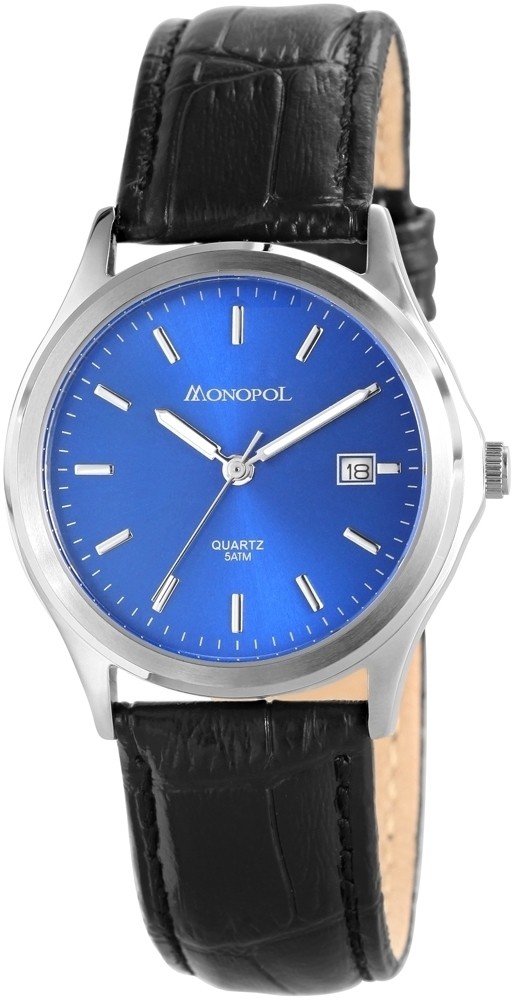 O relógio analógico masculino da marca Monopol possui um movimento de quartzo de alta qualidade. A pulseira em couro genuíno tem 20 mm de largura e abre com uma fivela. O comprimento total é de 23 cm. A caixa de aço inoxidável com vidro mineral tem dimensão de 38 mm e altura de caixa de 10 mm. A tampa da caixa é feita de aço inoxidável. O relógio é testado com pressão de 5 ATM. O relógio possui os seguintes recursos: Exibição de data.