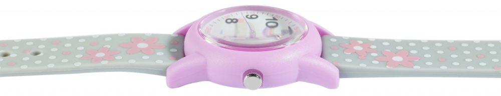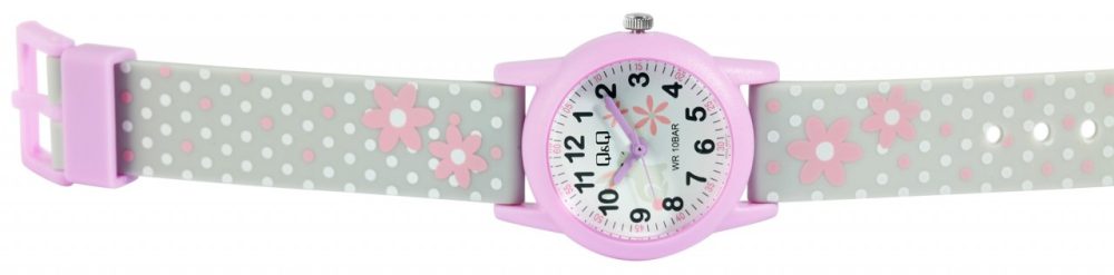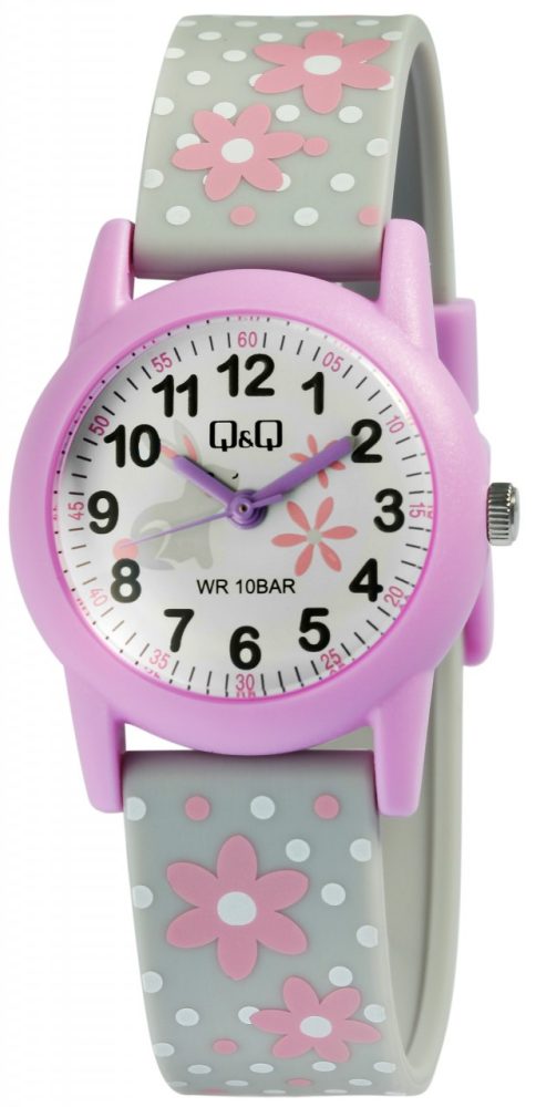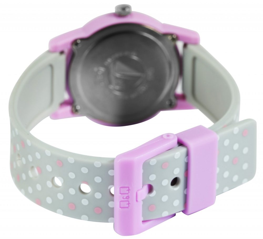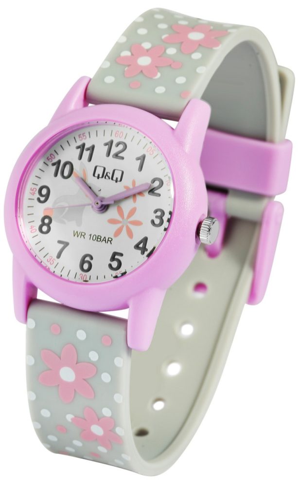 O relógio de pulso analógico de 3 ponteiros para criança da marca Q&Q possui um movimento de quartzo de alta qualidade. A bracelete de silicone cinzenta tem 16 mm de largura na extremidade e pode ser aberta e fechada com uma fivela de plástico roxa. O comprimento total do relógio é de 22,5 cm. A caixa de plástico de cor púrpura com vidro de plástico tem um diâmetro de 30 mm e uma altura de 10 mm. O fundo da caixa é feito de aço inoxidável. A bracelete de silicone é decorada com motivos florais e pontos e é confortável de usar. Além disso, é extremamente resistente. As flores também se reflectem no mostrador. Os algarismos árabes pretos e os ponteiros roxos no mostrador branco tornam a leitura das horas numa brincadeira de crianças.