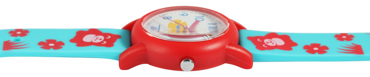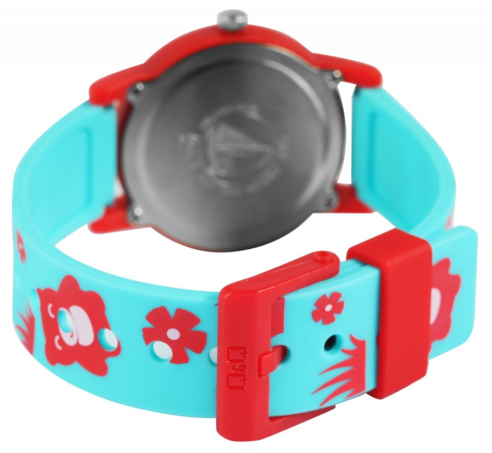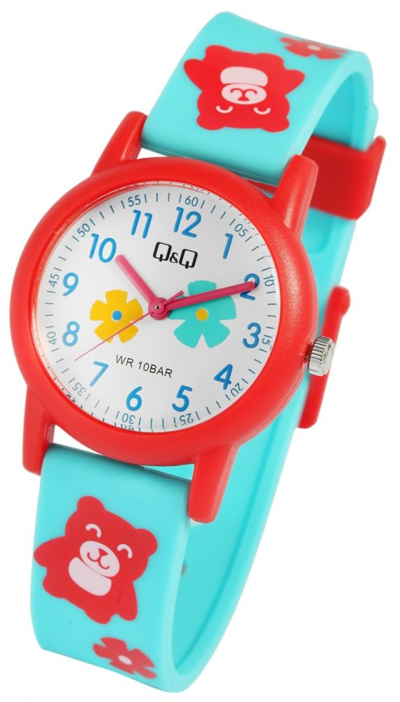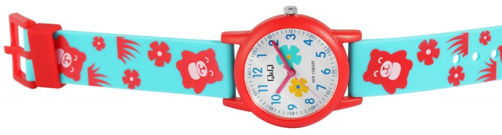 O relógio de pulso analógico de 3 ponteiros para criança da marca Q&Q possui um movimento de quartzo de alta qualidade. A bracelete de silicone de cor turquesa tem 16 mm de largura na extremidade e pode ser aberta e fechada com uma fivela de plástico vermelha. O comprimento total do relógio é de 22,5 cm. A caixa de plástico vermelha com vidro de plástico tem um diâmetro de 32 mm e uma altura de 10 mm. O fundo da caixa é feito de aço inoxidável. A bracelete de silicone está decorada com ursinhos de peluche e motivos florais e é confortável de usar. Além disso, é extremamente resistente. Os motivos florais também se reflectem no mostrador. Os algarismos azuis em estilo árabe e os ponteiros cor-de-rosa tornam a leitura das horas numa brincadeira de crianças. Este relógio é uma forma divertida de as crianças aprenderem a ver as horas e vai pôr um sorriso no rosto do pequeno utilizador.