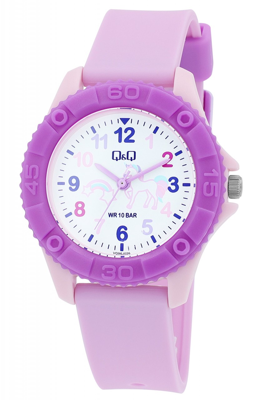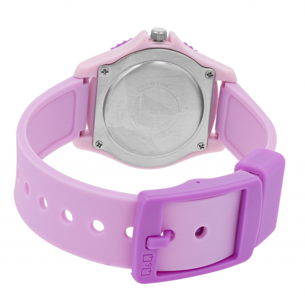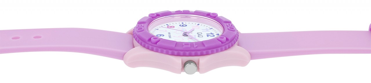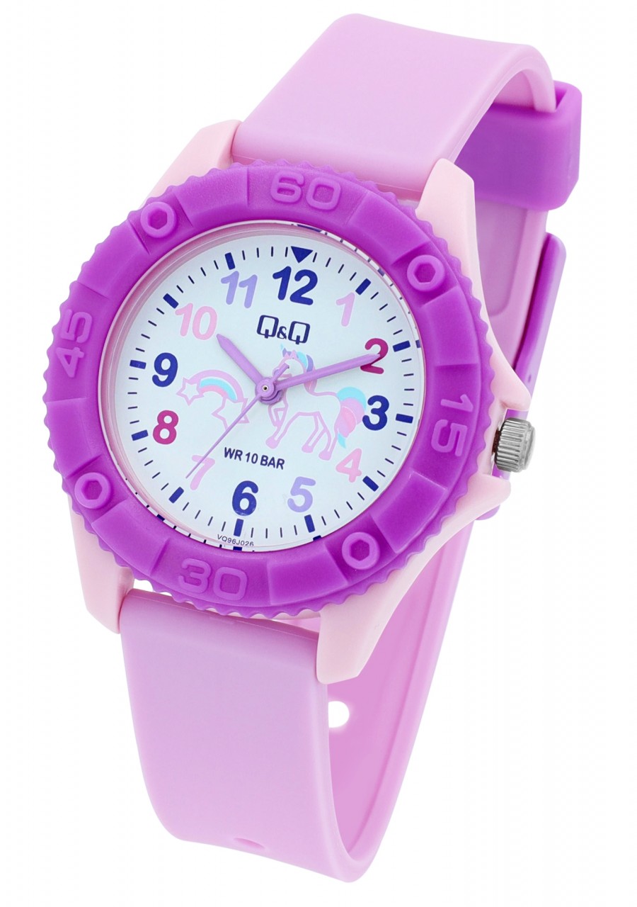 Relógio infantil Q&Q com bracelete de silicone – um acessório alegre que não só indica as horas, como também inspira a imaginação das crianças. O movimento de quartzo de alta qualidade garante não só leituras precisas das horas, mas também uma longevidade fiável. Com uma resistência à água de uns impressionantes 10 ATM, este relógio é perfeito para todas as aventuras, quer seja a chapinhar na piscina ou a brincar ao ar livre. A bracelete de silicone de cor púrpura não só garante um ajuste confortável, como também confere ao relógio para criança um charme divertido. A fivela com pino garante que o relógio fica bem fixo no pulso. A caixa de plástico com uma luneta de cor púrpura acrescenta um toque de moda e faz deste relógio um verdadeiro chamariz. O mostrador apresenta um unicórnio com um arco-íris que fará o coração das raparigas bater mais depressa. Com um diâmetro de caixa de 35 mm.
