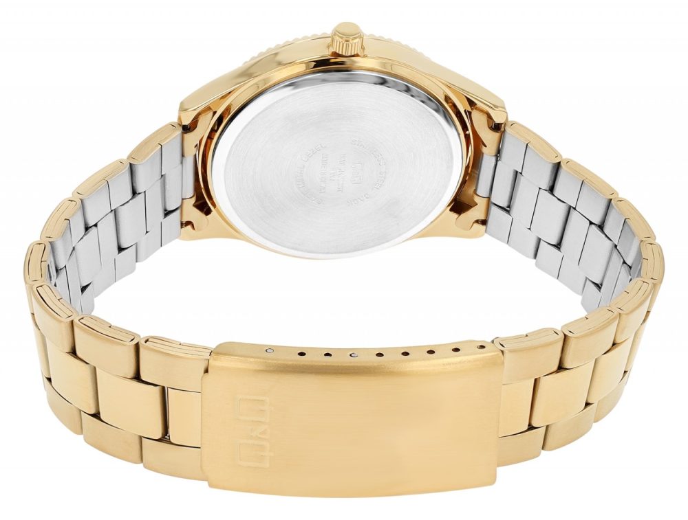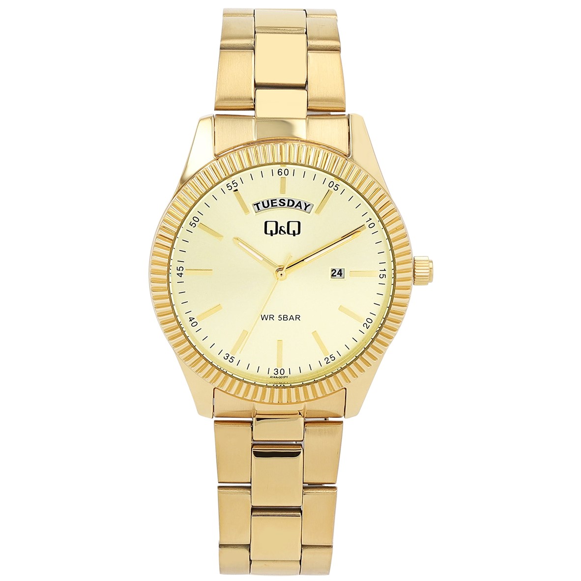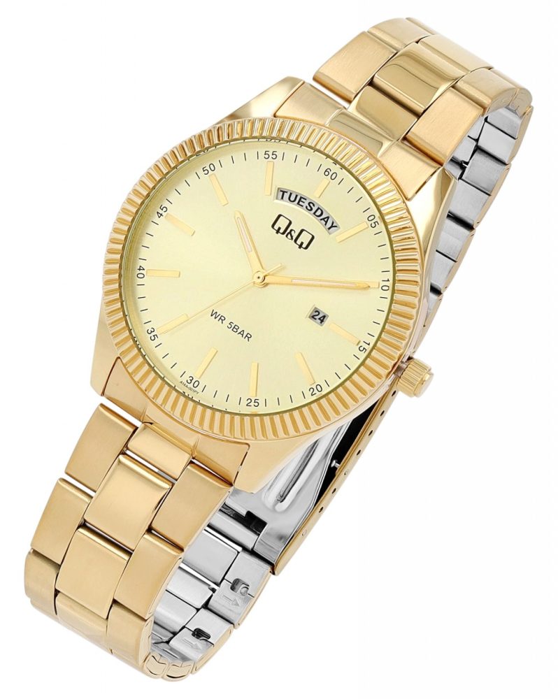 Este relógio masculino Q&Q em tom dourado radiante é mais do que apenas um relógio. Este relógio incorpora precisão e design inovador em perfeita harmonia. O coração deste relógio bate no movimento de quartzo de alta qualidade, que não só garante precisão absoluta, mas também permite uma exibição da data na posição das 3 horas e uma exibição exclusiva dos dias da semana em vermelho entre 11 e 1 hora. Isso não é apenas prático, mas também chama a atenção. O esplendor dourado deste relógio estende-se por todo o design, começando pela caixa, com diâmetro de 40 mm e altura de 10 mm, feita de metal durável e protegida com vidro mineral resistente a riscos. Os índices de linha no mostrador dourado conferem a este relógio masculino uma aparência única e elegante. Este relógio é dotado de uma resistência à água de 5 ATM.