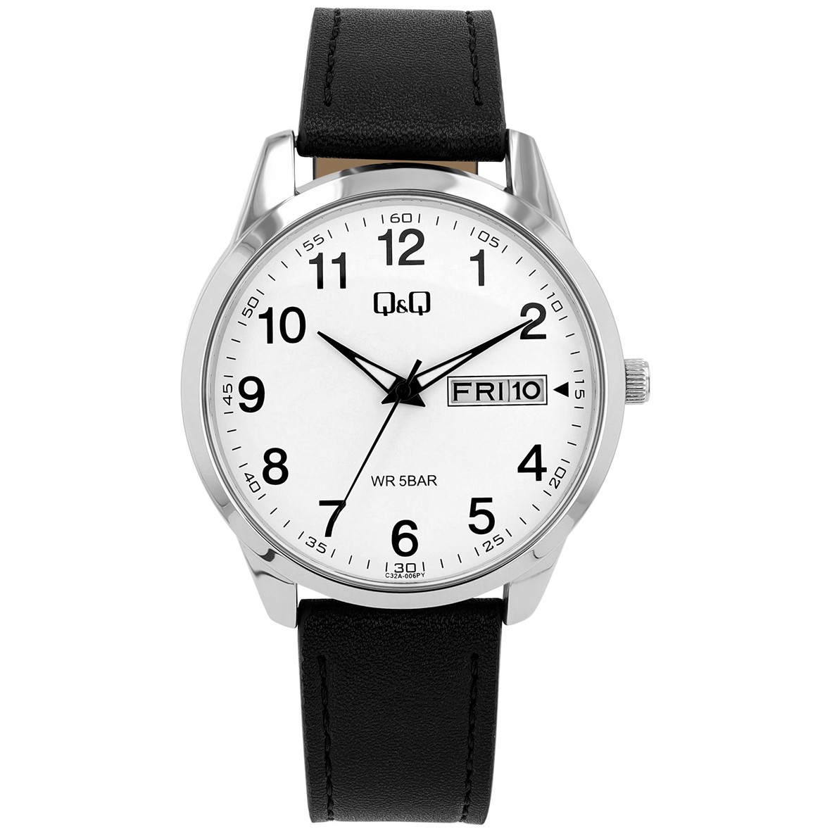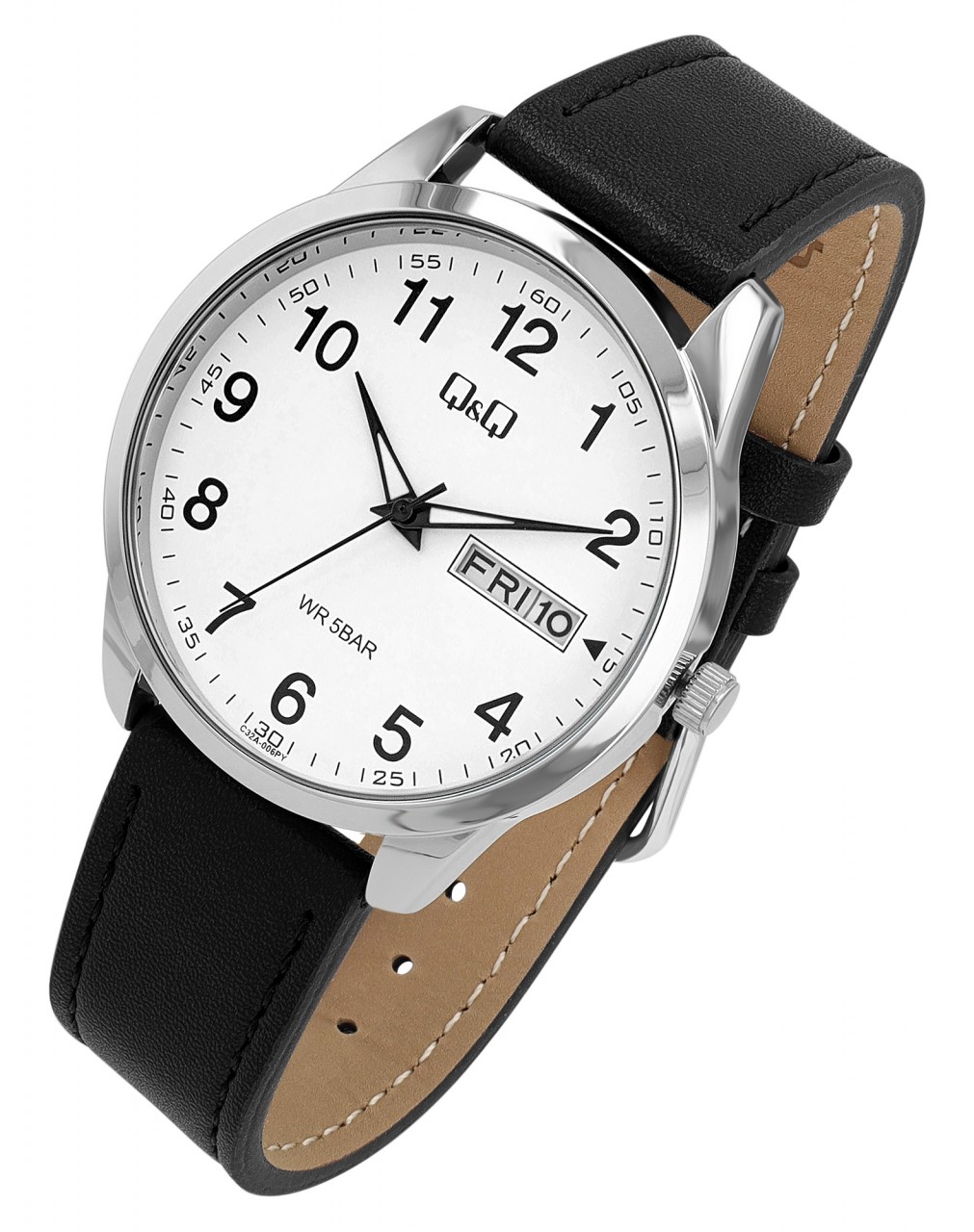 Experimente o mundo do tempo de uma nova maneira com nosso relógio masculino Q&Q com exibição de dia da semana e data! Este relógio de pulso analógico combina funcionalidade e elegância em perfeita harmonia. O movimento de quartzo de alta qualidade garante cronometragem precisa. Os algarismos arábicos no mostrador conferem ao relógio um toque clássico e garantem uma legibilidade sem esforço. A exibição do dia da semana e da data no mostrador do relógio permite manter-se atualizado sem precisar olhar para o smartphone. O relógio masculino Q&Q com pulseira de couro não é apenas um atrativo estético, mas também um companheiro confiável em todas as situações. Com resistência à água de até 5 ATM, pode ser usado com segurança no dia a dia, seja lavando as mãos, em tempo chuvoso ou até mesmo nadando – este relógio está pronto para qualquer aventura.