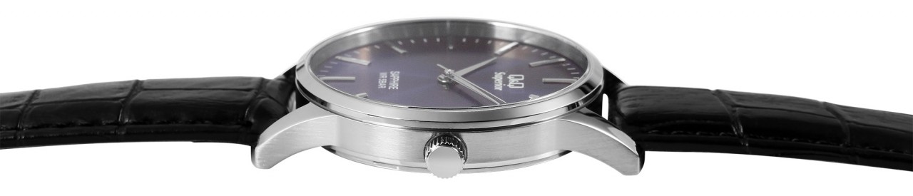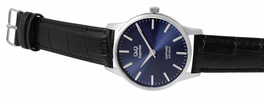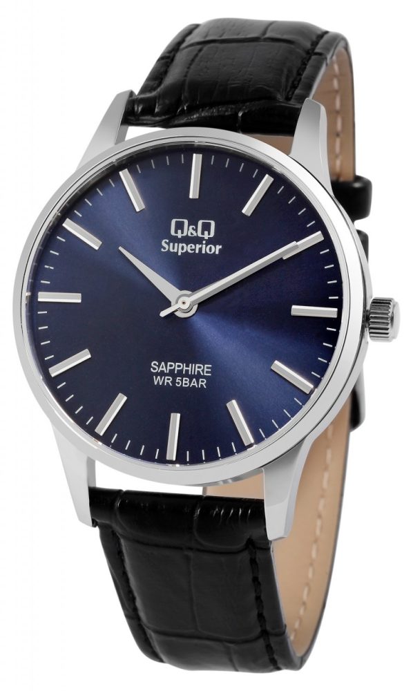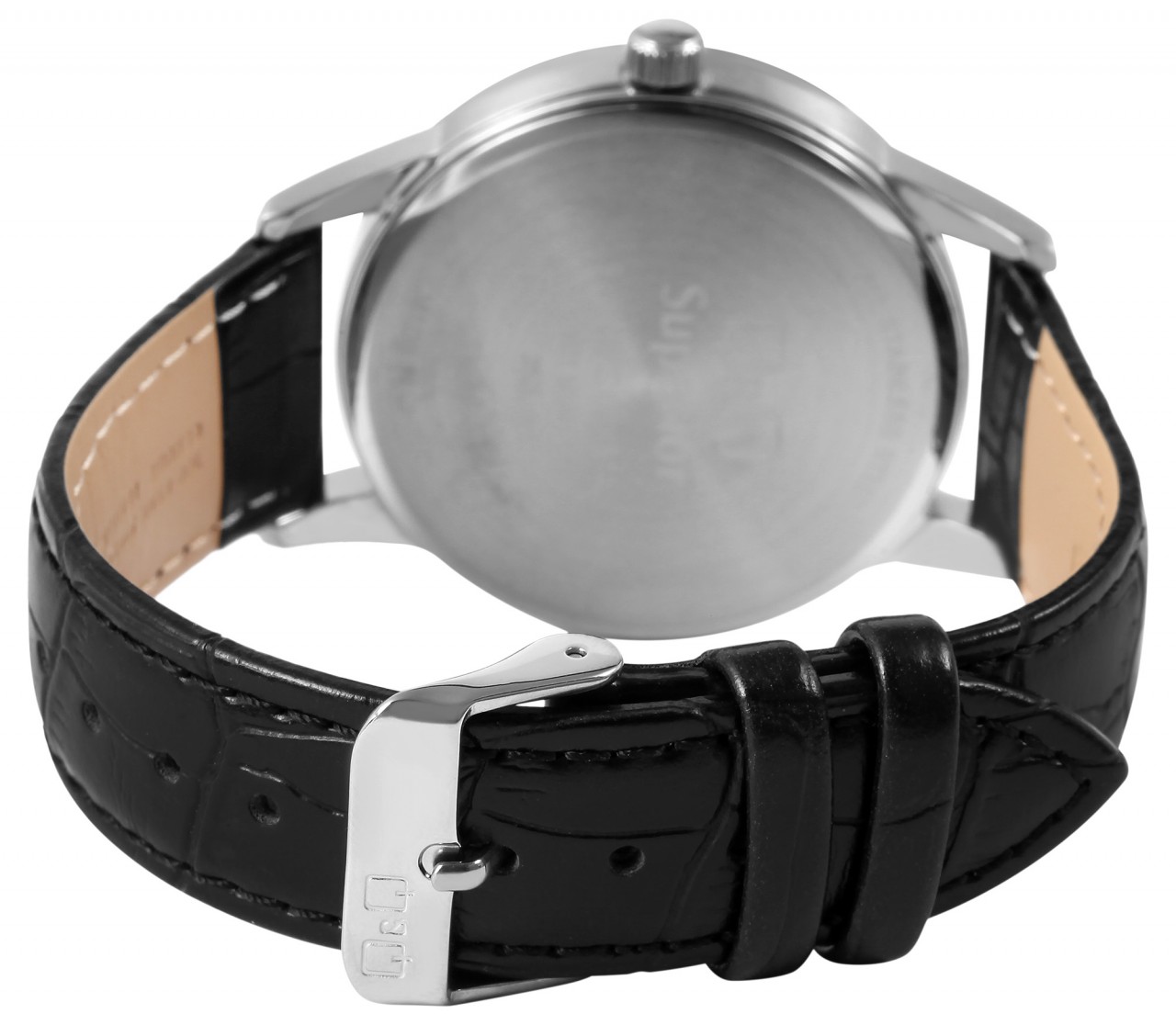 O relógio de pulso analógico masculino de 3 ponteiros da marca Q&Q possui um movimento de quartzo preciso e de alta qualidade da marca Miyota. A pulseira em couro genuíno preto com relevo tem 20 mm de largura nas alças e pode ser aberta e fechada com uma fivela de aço inoxidável prateada. A pulseira acolchoada garante um ajuste confortável e é perfeita para quem sofre de alergias devido à matéria-prima natural. O comprimento total do relógio é de 24 cm. A caixa do relógio prateada com cristal de safira tem um diâmetro de 40 mm e uma altura de 9 mm. A hora pode ser facilmente lida através do mostrador azul com um índice de linha prateado. O fundo da caixa também é feito de aço inoxidável e o relógio tem resistência à água de 5 bar. O relógio masculino impressiona pelo seu design clássico e elegante.
