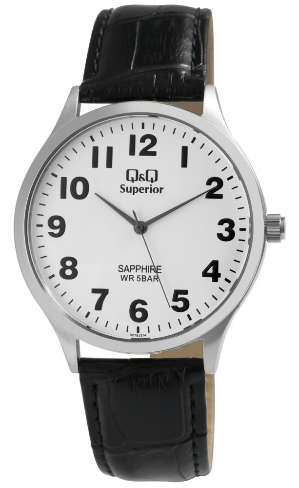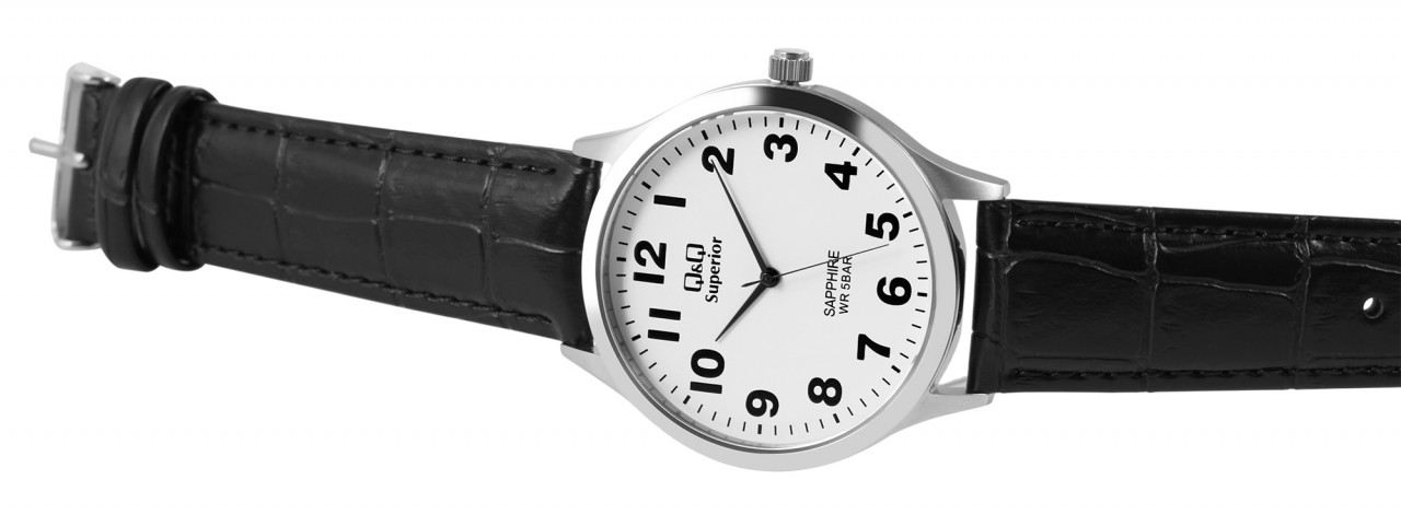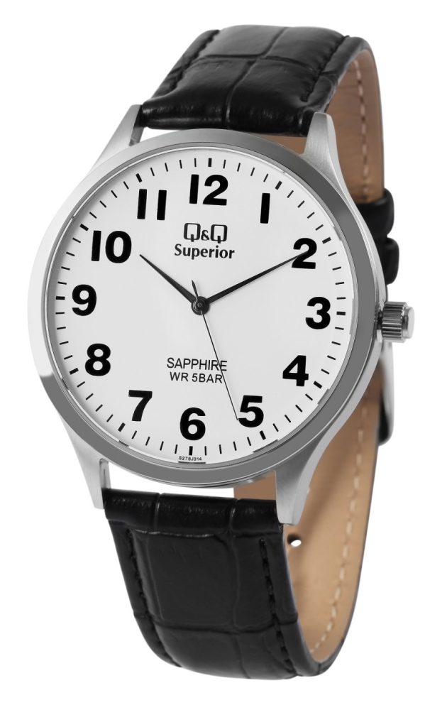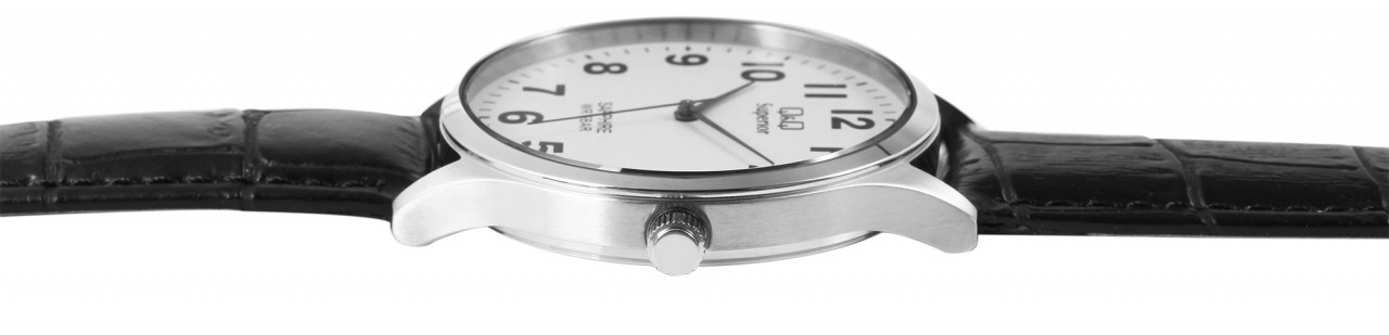 O relógio de pulso analógico masculino de 3 ponteiros da marca Q&Q possui um movimento de quartzo preciso e de alta qualidade da marca Miyota. A pulseira em couro genuíno preto com relevo tem 20 mm de largura nas alças e pode ser aberta e fechada com uma fivela de aço inoxidável prateada. A pulseira acolchoada garante um ajuste confortável e é perfeita para quem sofre de alergias devido à matéria-prima natural. O comprimento total do relógio é de 24 cm. A caixa do relógio prateada com cristal de safira tem um diâmetro de 40 mm e uma altura de caixa de 8 mm. A hora pode ser facilmente lida graças ao mostrador branco com algarismos pretos em estilo árabe. O fundo da caixa também é feito de aço inoxidável e o relógio tem resistência à água de 5 bar. O relógio masculino impressiona pelo seu design clássico e elegante.