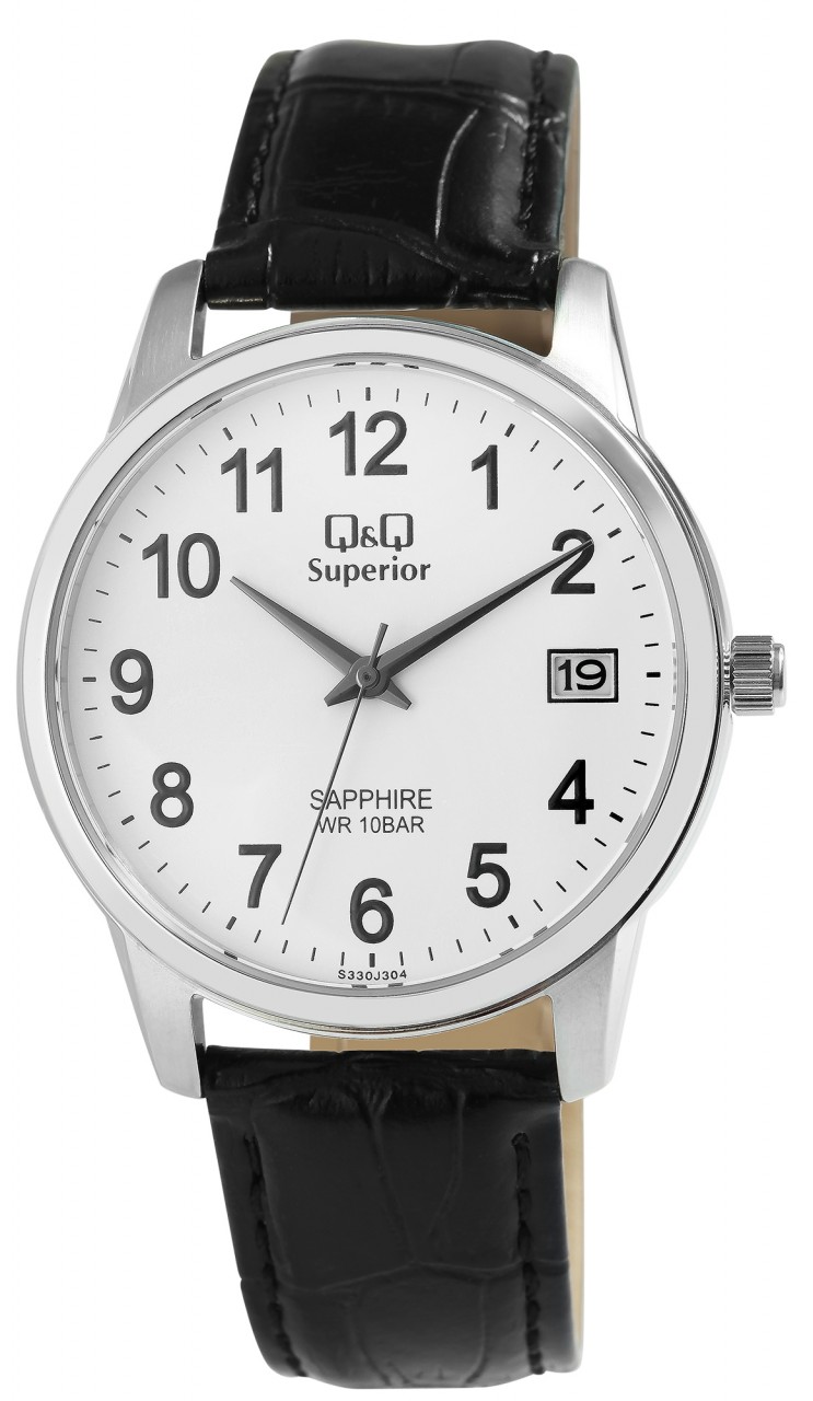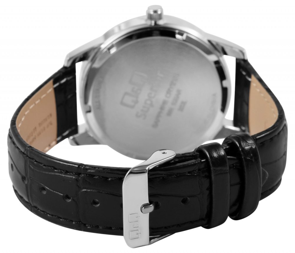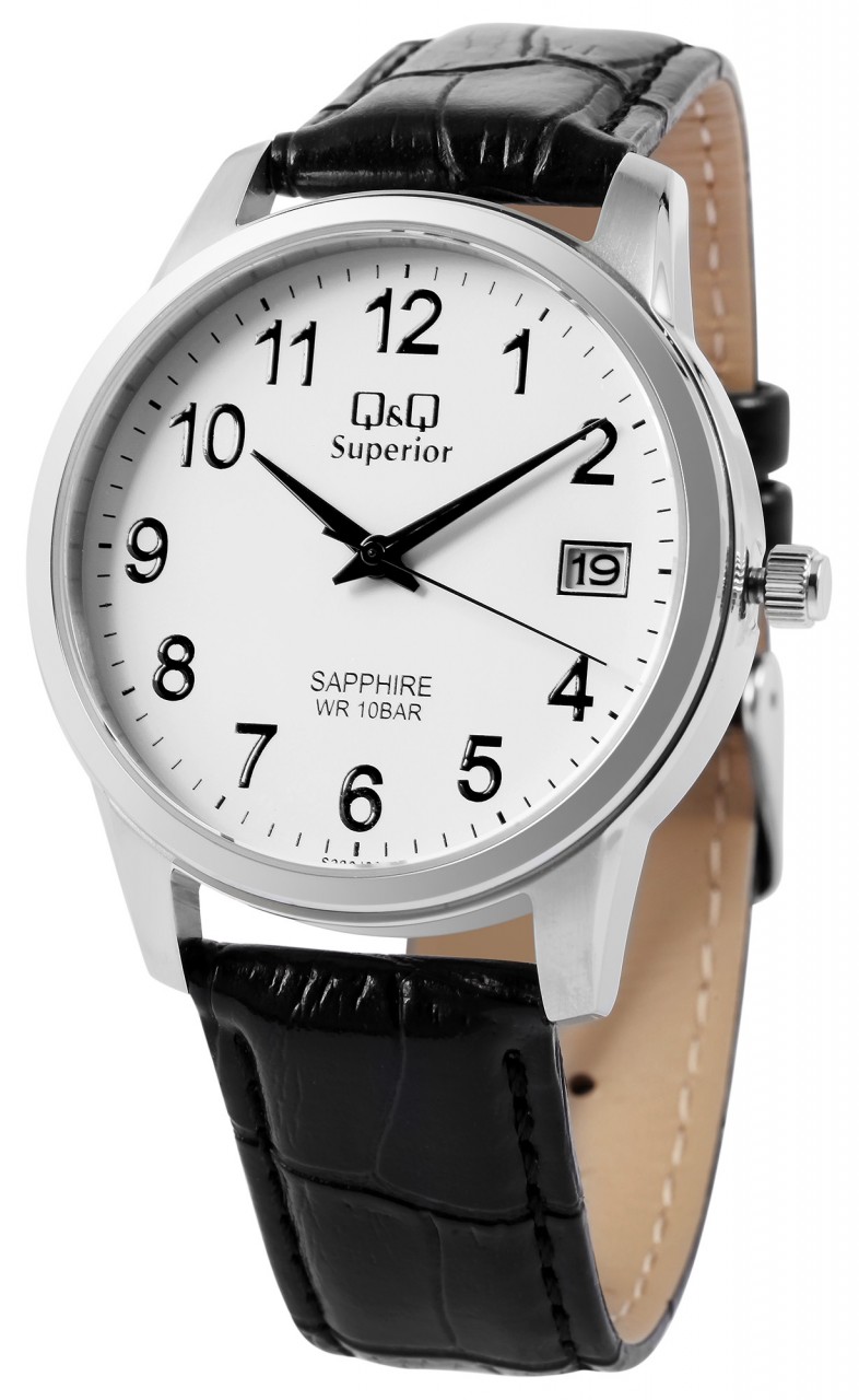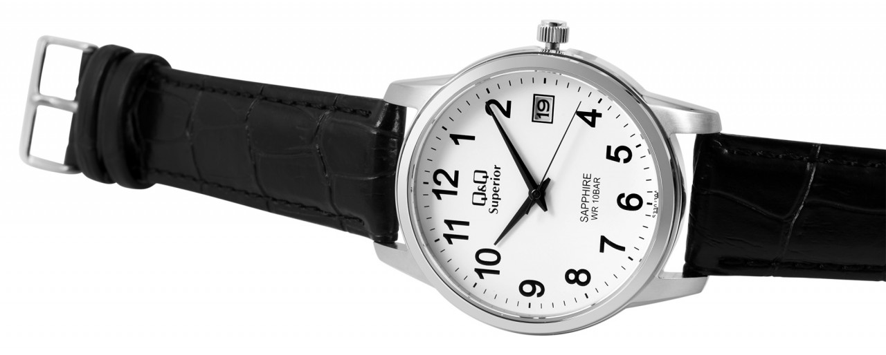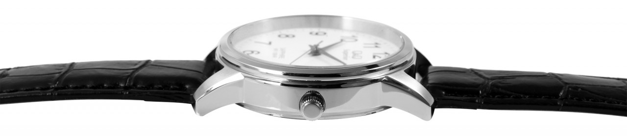 O relógio de pulso analógico masculino de 3 ponteiros da marca Q&Q possui um movimento de quartzo preciso e de alta qualidade da marca Miyota. A pulseira em couro genuíno preto com relevo tem 20 mm de largura nas alças e pode ser aberta e fechada com uma fivela de aço inoxidável prateada. A pulseira acolchoada garante um ajuste confortável e é perfeita para quem sofre de alergias devido à matéria-prima natural. O comprimento total do relógio é de 24,5 cm. A caixa do relógio prateada com cristal de safira tem um diâmetro de 40 mm e uma altura de 11 mm. A hora pode ser facilmente lida graças ao mostrador branco com algarismos pretos em estilo árabe. Além da hora, a data atual também é exibida às três horas. O fundo da caixa também é feito de aço inoxidável e o relógio tem resistência à água de 10 bar.