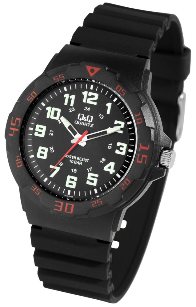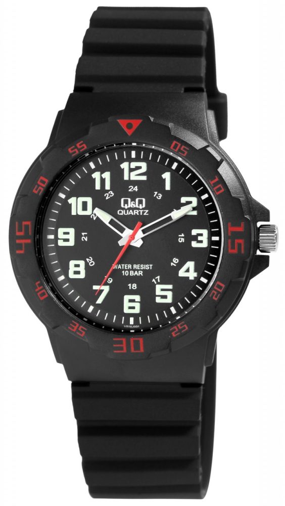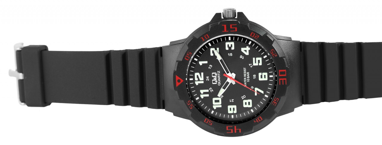 O relógio de pulso analógico de 3 ponteiros para homem da marca Q&Q possui um movimento de quartzo de alta qualidade. A bracelete de silicone preta tem 22 mm de largura na extremidade e pode ser aberta e fechada com uma fivela de pino prateada. O comprimento total do relógio é de 25 cm. A caixa em plástico preto com vidro mineral tem um diâmetro de 43 mm e uma altura de 11 mm. O fundo da caixa é feito de aço inoxidável. Os ponteiros e os índices são revestidos com Superluminova, facilitando a leitura das horas mesmo no escuro. O relógio tem uma resistência à água de 10 bar.