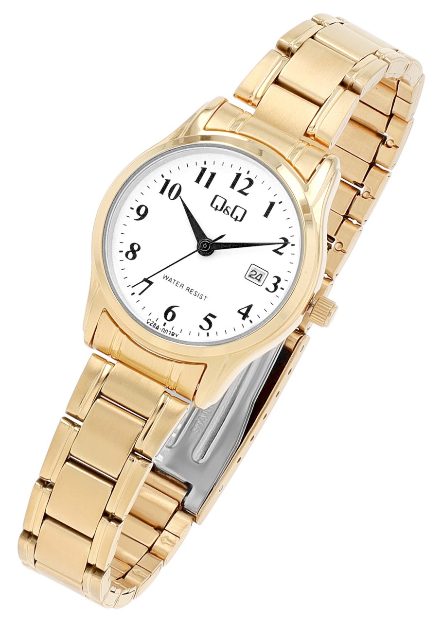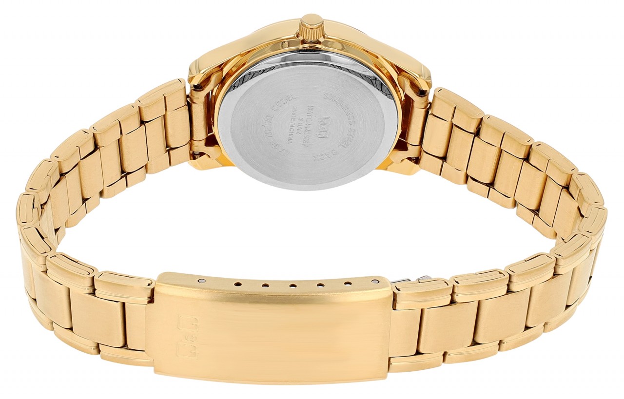 O relógio feminino Q&Q com pulseira de aço inoxidável e display de data é o produto perfeito para expandir a sua gama de produtos. Q&Q significa a mais alta qualidade e precisão. Este relógio de pulso feminino é movido por um movimento de quartzo de primeira classe que se caracteriza por uma confiabilidade excepcional. Uma funcionalidade prática que os seus clientes apreciam é a exibição da data às três horas, que garante que o utilizador deste relógio esteja sempre bem informado. A pulseira de aço inoxidável dourada não é apenas elegante, mas também extremamente durável. Graças aos elementos encurtáveis, cabe perfeitamente em qualquer pulso, o que aumenta ainda mais a atratividade deste relógio para os seus clientes. O fecho dobrável em aço inoxidável garante um ajuste seguro e fácil manuseio. Este relógio é dotado de uma resistência à água de 3 ATM.