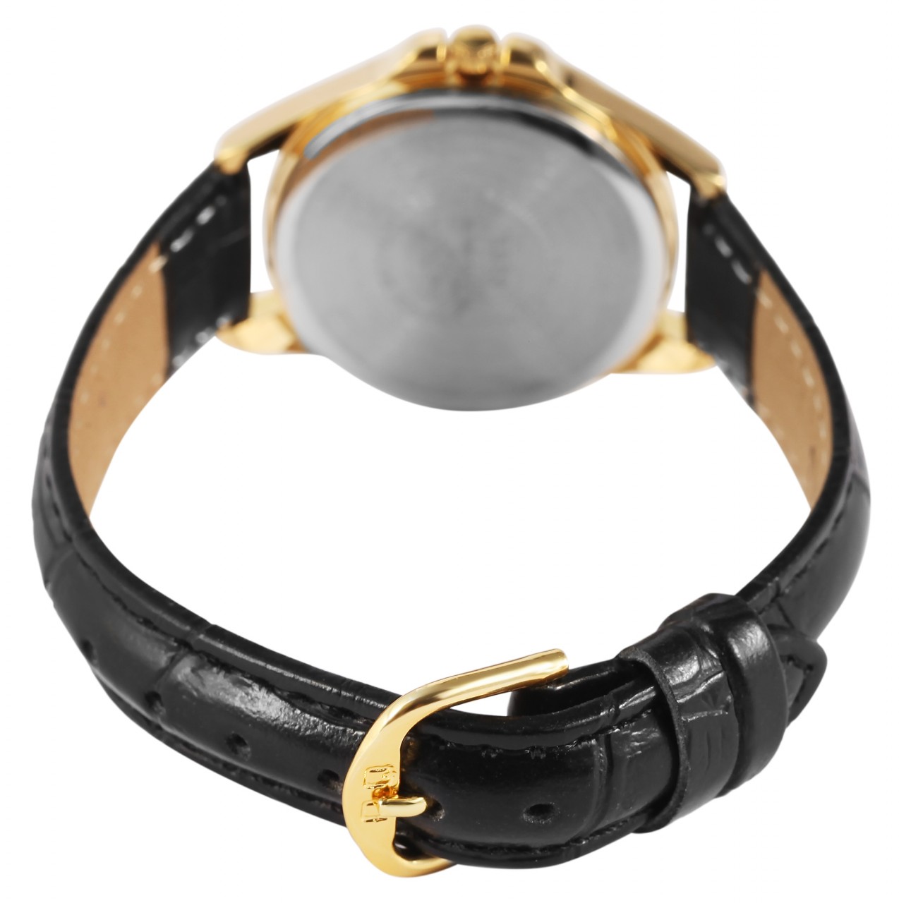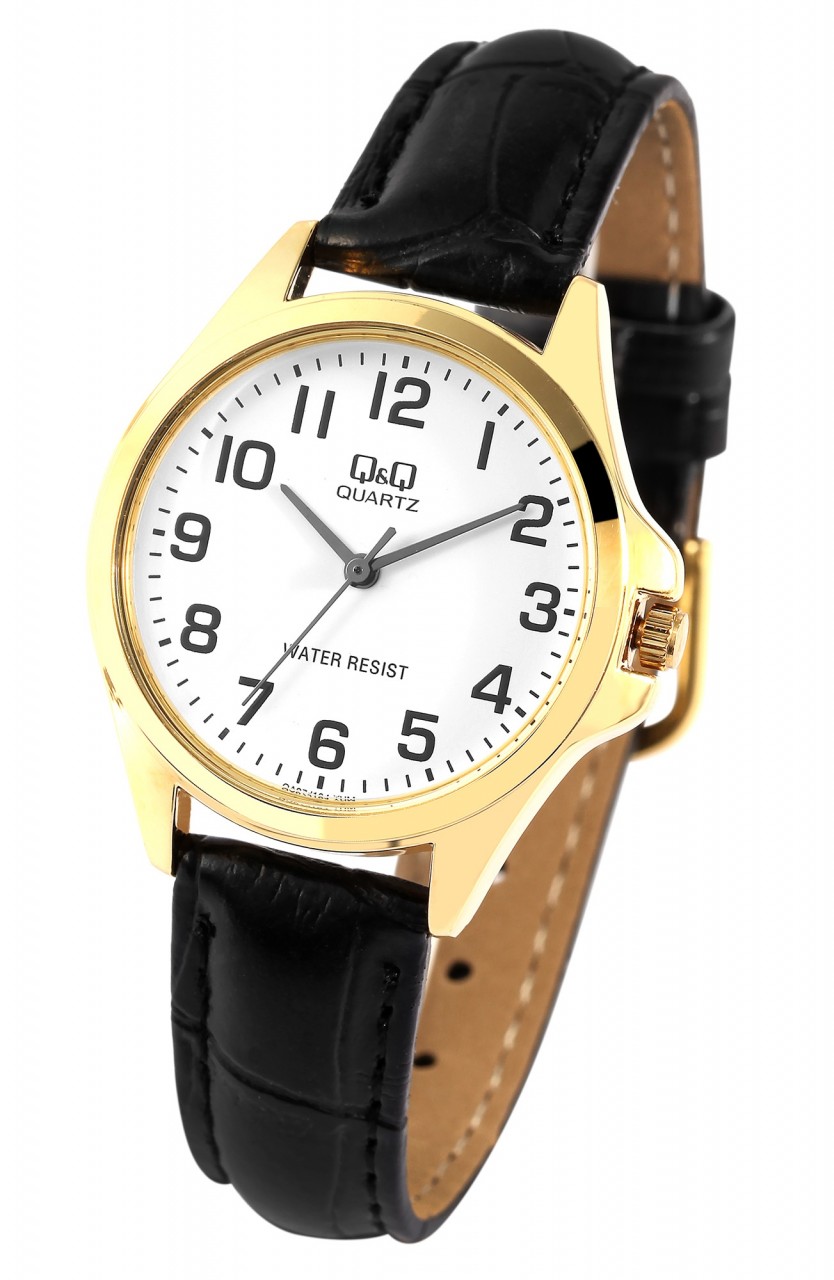 Relógio feminino Q&Q com pulseira de couro sintético em preto/ouro, 3 bar à prova d’água, movimento quartzo de alta qualidade.