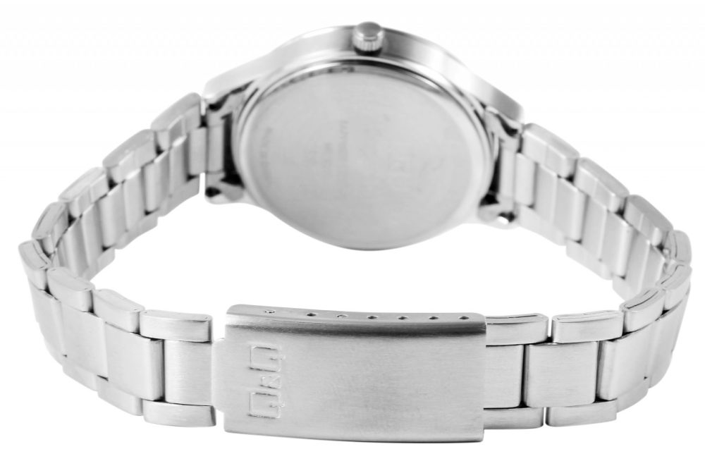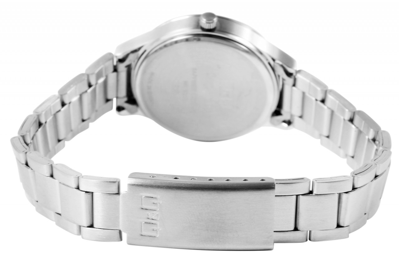 O relógio de pulso feminino analógico de 3 ponteiros da marca Q&Q possui um movimento de quartzo preciso e de alta qualidade da marca Miyota. A pulseira em aço inoxidável prateado tem 14 mm de largura nas alças e pode ser aberta e fechada usando um fecho dobrável em aço inoxidável. A pulseira do relógio é particularmente robusta e durável e pode ser encurtada conforme desejado usando uma ferramenta adequada, graças aos elementos removíveis. A combinação de elementos mate e brilhantes do relógio fazem do relógio um acessório especial. O comprimento total do relógio é de 20 cm. A caixa do relógio prateada com cristal de safira tem um diâmetro de 29 mm e uma altura de caixa de 8 mm. O relógio feminino impressiona pelo seu design clássico e elegante. A hora pode ser facilmente lida graças ao mostrador transparente com índices prateados.