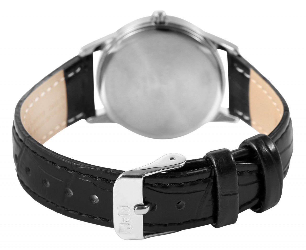 O relógio de pulso feminino analógico de 3 ponteiros da marca Q&Q possui um movimento de quartzo preciso e de alta qualidade da marca Miyota. A pulseira em couro genuíno preto com relevo tem 16 mm de largura nas alças e pode ser aberta e fechada usando uma fivela de aço inoxidável prateada. A pulseira acolchoada garante um ajuste confortável e é perfeita para quem sofre de alergias devido à matéria-prima natural. O comprimento total do relógio é de 22 cm. A caixa do relógio prateada com cristal de safira tem um diâmetro de 31 mm e uma altura de caixa de 8 mm. A hora pode ser facilmente lida graças ao mostrador branco com algarismos…