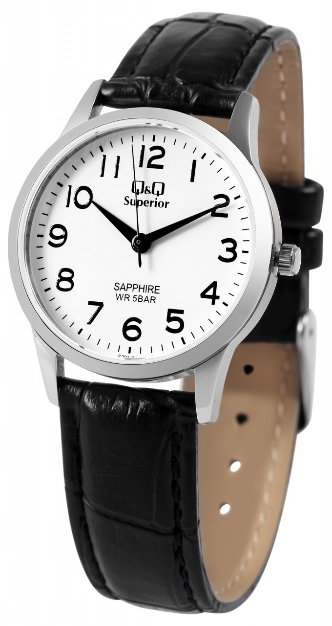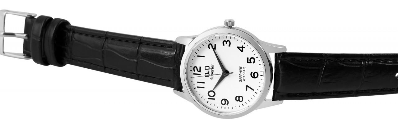 O relógio de pulso feminino analógico de 3 ponteiros da marca Q&Q possui um movimento de quartzo preciso e de alta qualidade da marca Miyota. A pulseira em couro genuíno preto com relevo tem 16 mm de largura nas alças e pode ser aberta e fechada usando uma fivela de aço inoxidável prateada. A pulseira acolchoada garante um ajuste confortável e é perfeita para quem sofre de alergias devido à matéria-prima natural. O comprimento total do relógio é de 22 cm. A caixa do relógio prateada com cristal de safira tem um diâmetro de 31 mm e uma altura de caixa de 8 mm. A hora pode ser facilmente lida graças ao mostrador branco com algarismos pretos em estilo árabe. O fundo da caixa também é feito de aço inoxidável e o relógio tem resistência à água de 5 bar. O relógio feminino impressiona pelo seu design clássico e elegante.