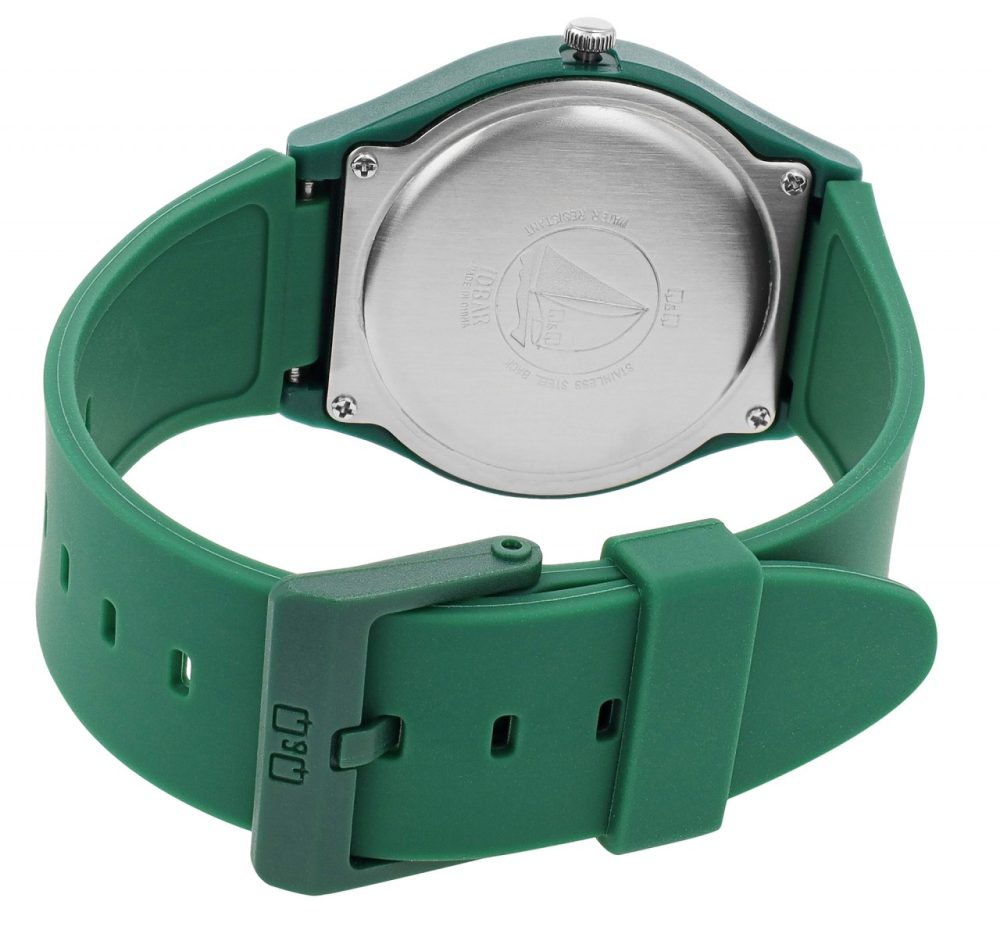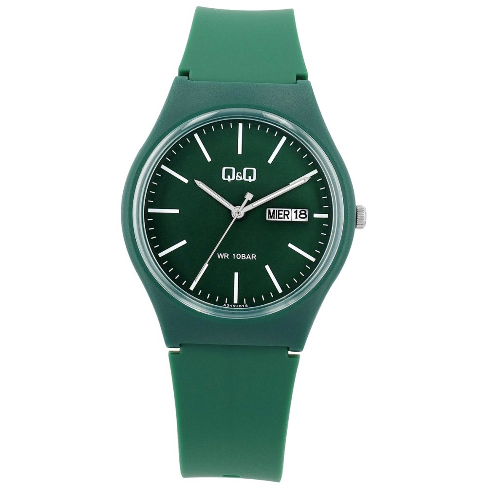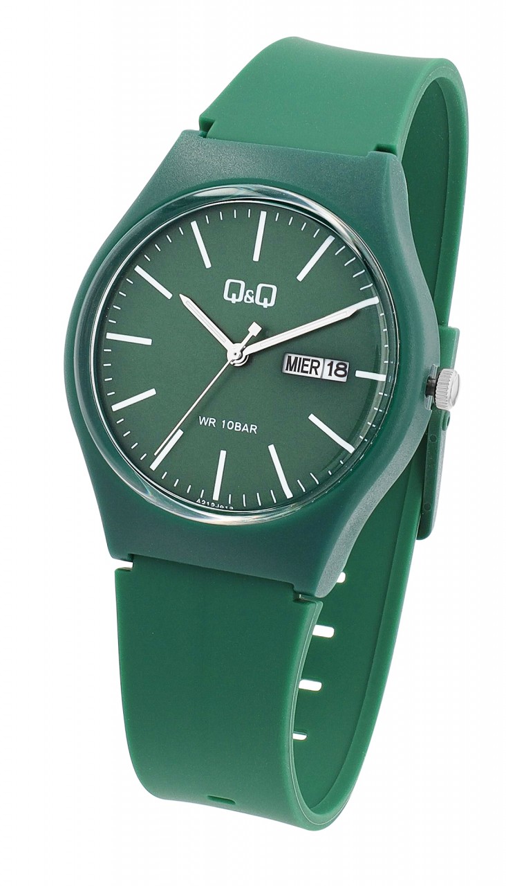 Este relógio de pulso verde da marca Q&Q não só impressiona pelo seu visual especial, mas também pela sua qualidade de primeira classe. O movimento de quartzo de alta qualidade garante uma cronometragem precisa na qual os seus clientes podem confiar. Mas isso não é tudo. Este relógio também oferece exibição da data e do dia da semana na posição das três horas, tornando-o um companheiro extremamente prático para o dia a dia. Com uma impressionante resistência à água de 10 bar, este relógio está pronto para qualquer desafio. Os seus clientes podem usá-los na piscina sem hesitação ou até mesmo durante um mergulho. A pulseira de silicone não só oferece conforto, mas também é extremamente durável e insensível. A caixa em um lindo tom verde é feita de plástico robusto e confere ao relógio um visual moderno.